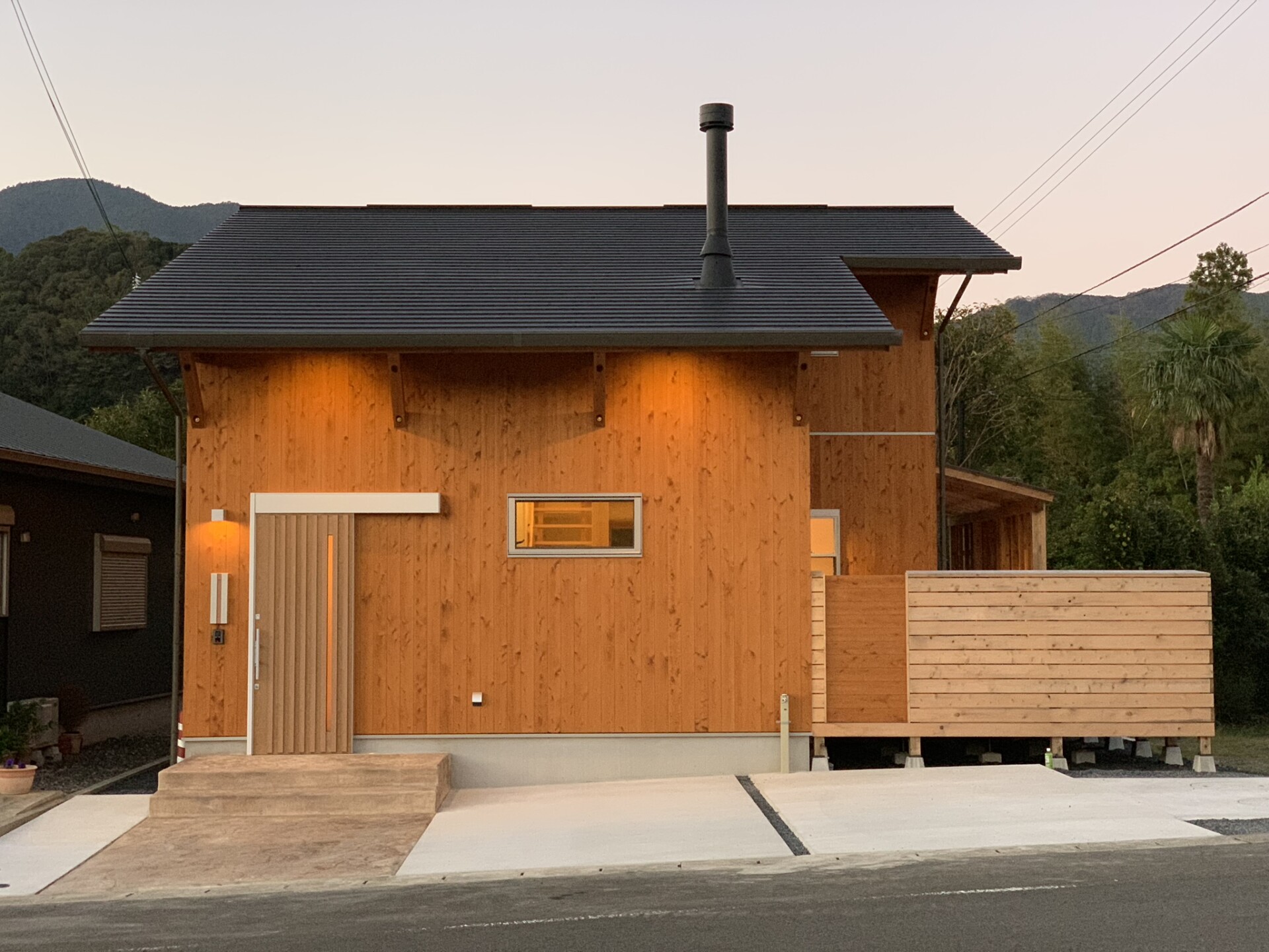 外観については、「平屋のような暮らしがしたい」というご要望もあり、地元の桧と杉、そして壁には、居室の天井高を低くし、登垂木を採用し、大屋根とし、建物全体の高さもおさえた外観にしました。