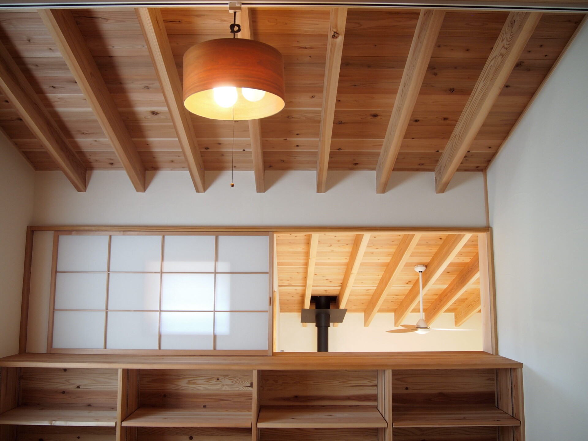 現しの登り梁は、特一材でありながらきれいな空間になるよう配置に拘り木配りをしました。