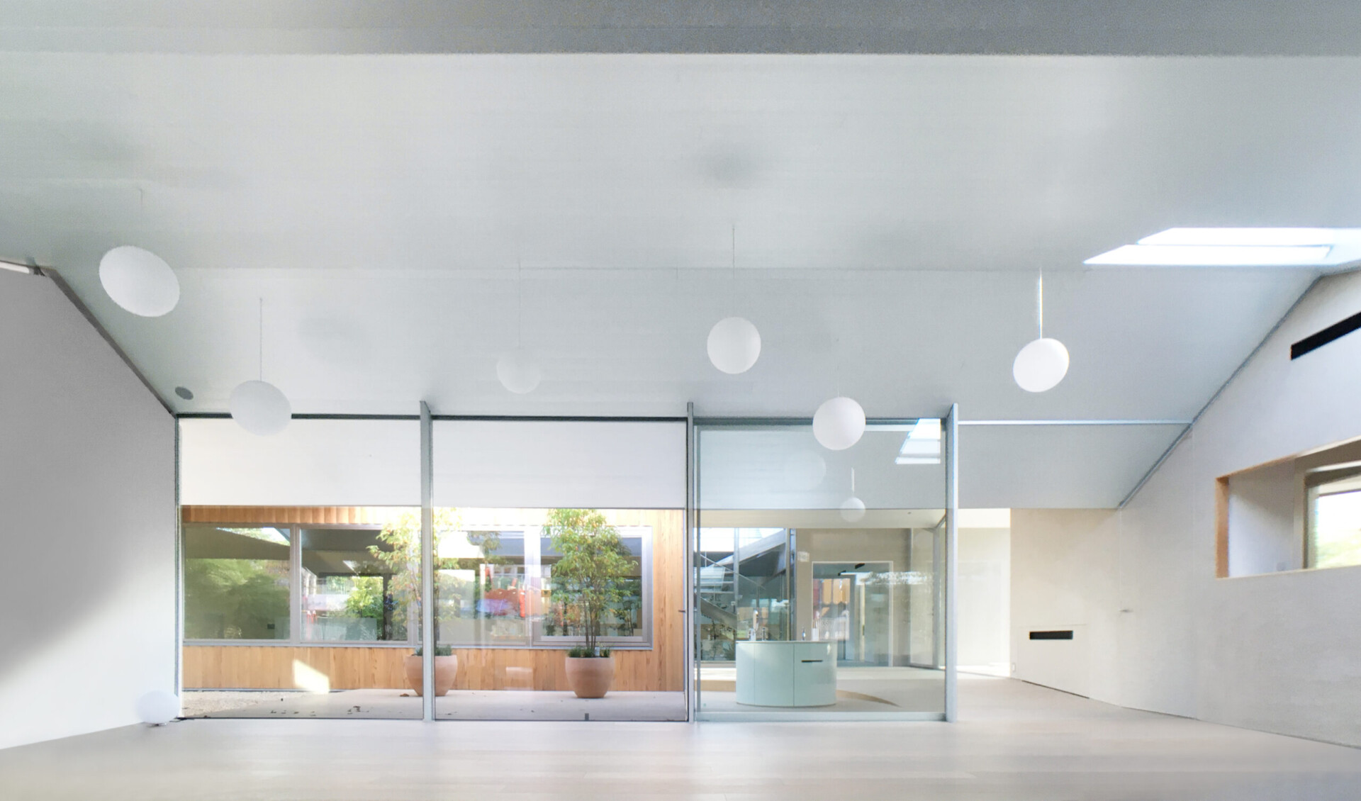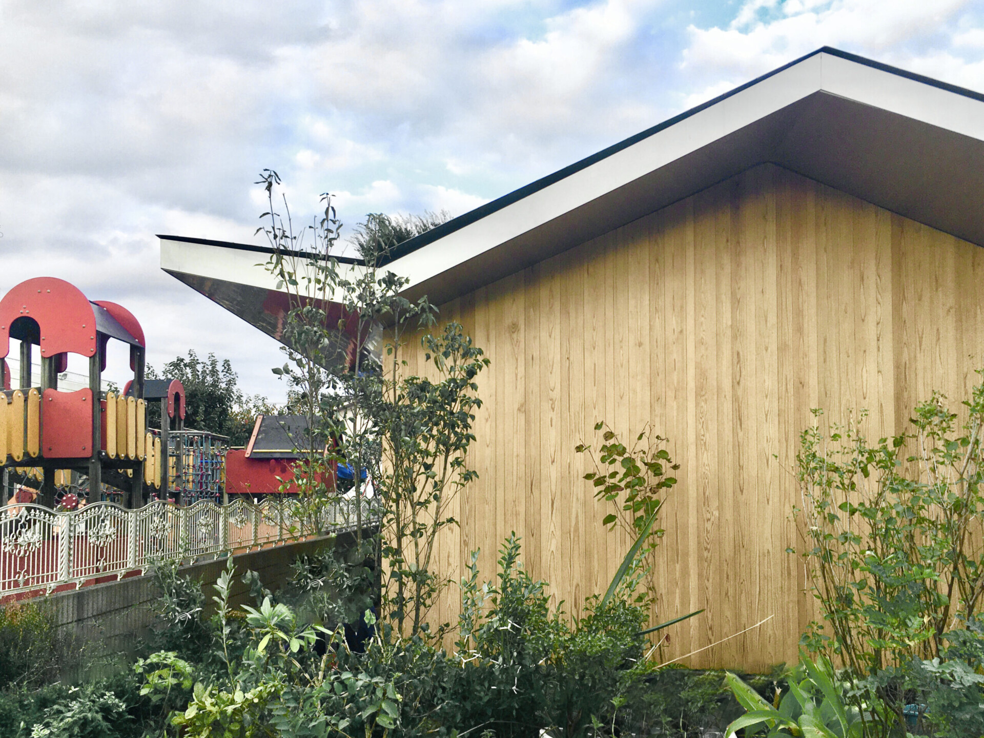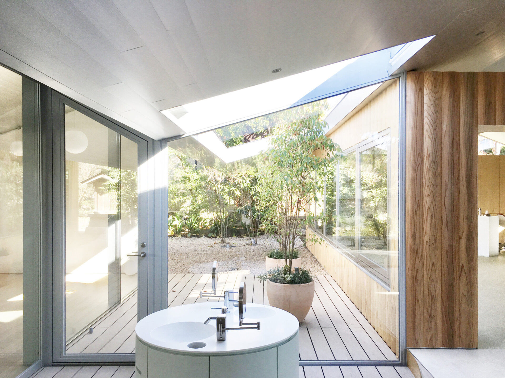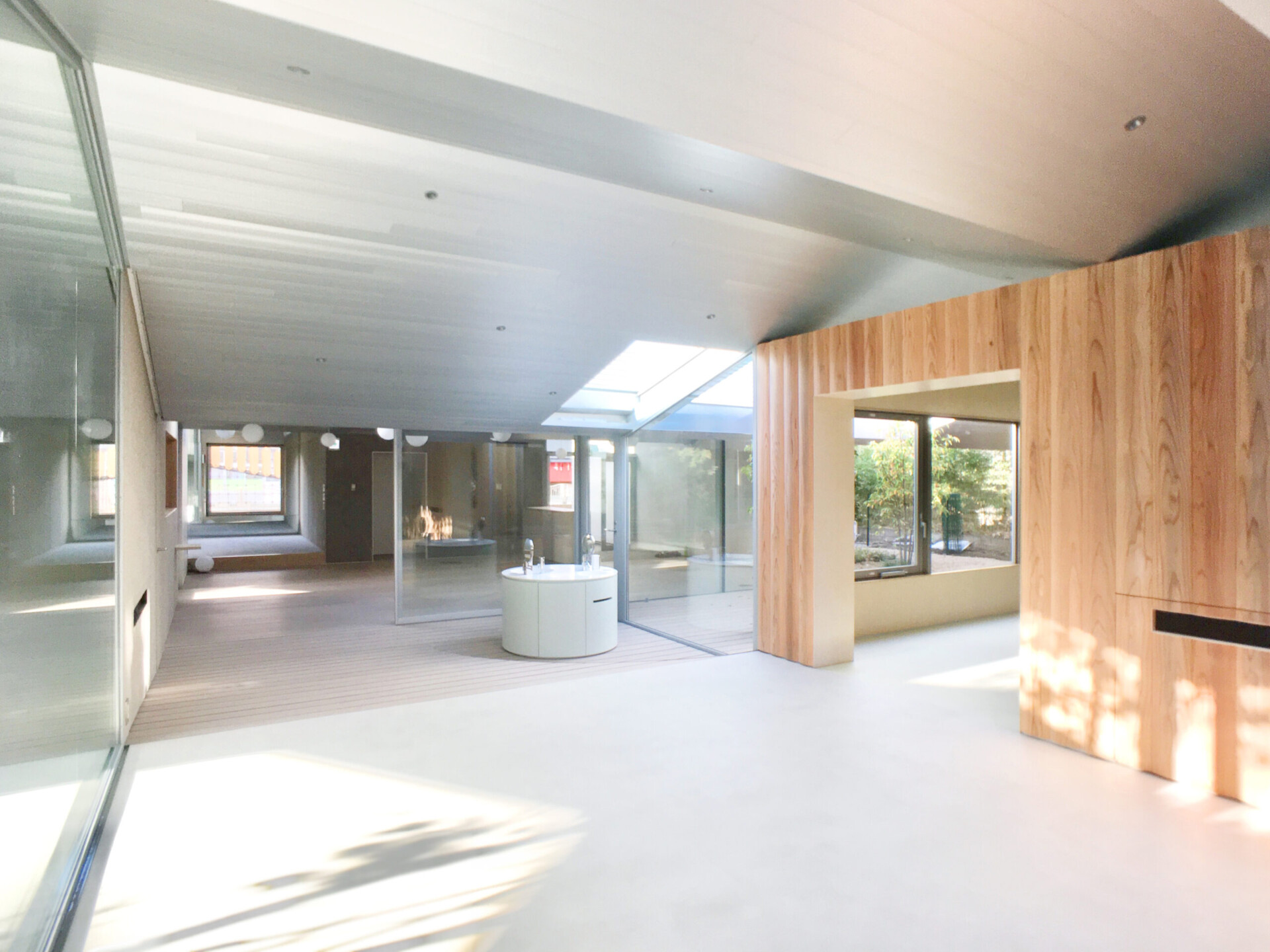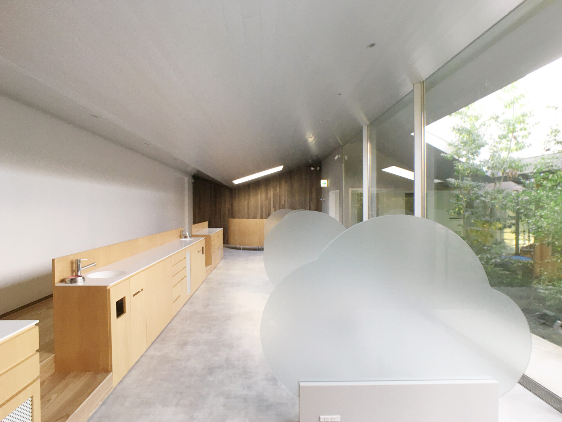 天井は鈍く反射するアルミを一様に使い、壁には木材やガラス、塗り壁など様々な素材を多用している。ひとつとして同じ表情を持たない木材については、凹凸や働き幅、風合いを変えて質の違いがより引き立つようにした。それは、異素材の重なりが森の四季折々と同じように鮮やかな景色の一部となって、外部と内部が柔らかく混ざり合う環境を意図したためである。