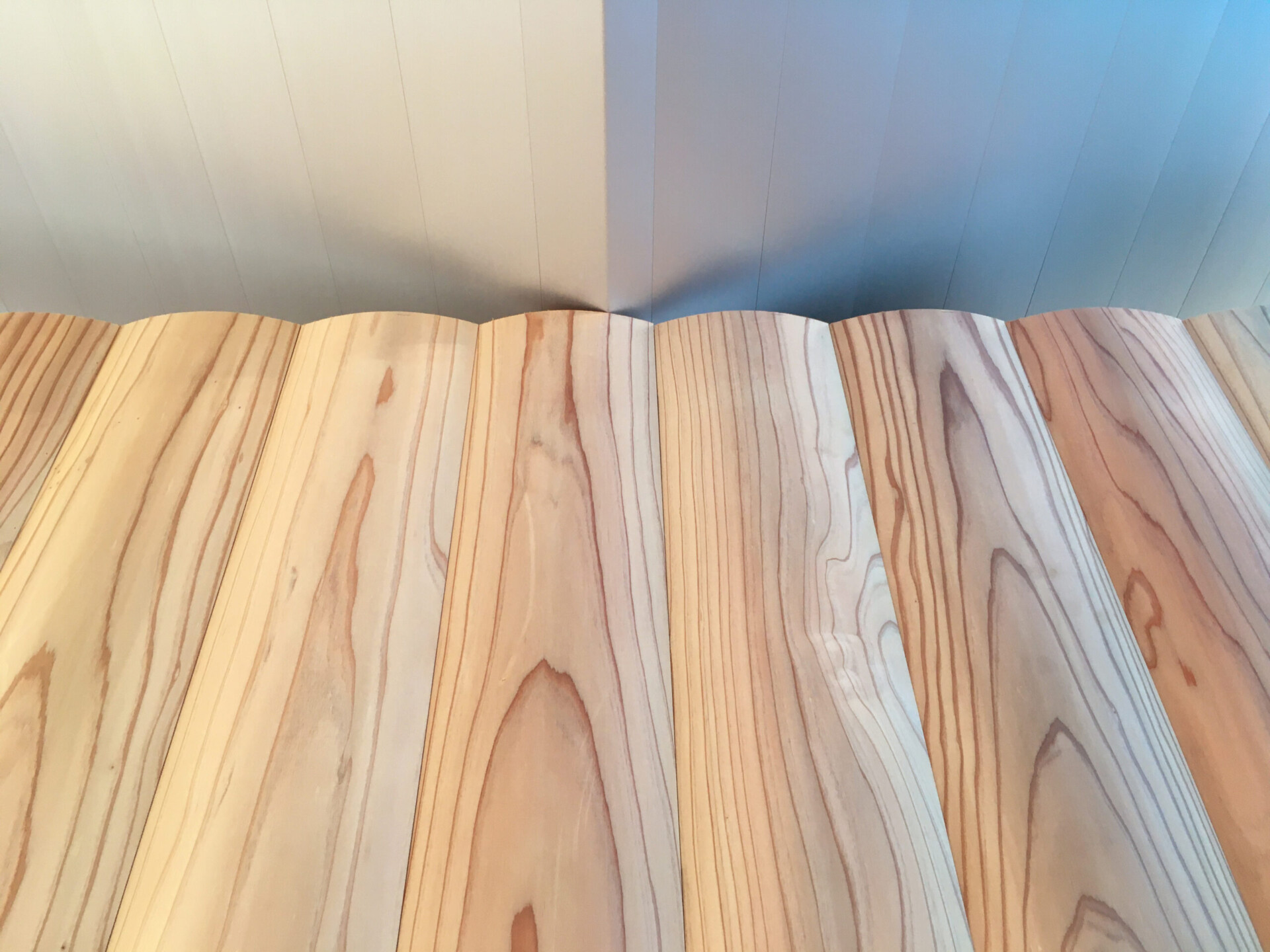 特注品となる為、規格品をカスタマイズしながら、なるべくコストダウンできる作り方を検討。サンプルを見ていただき、お打ち合わせを重ね、同じ杉材でありながら色々な表情を持った壁板たちが出来上がりました。