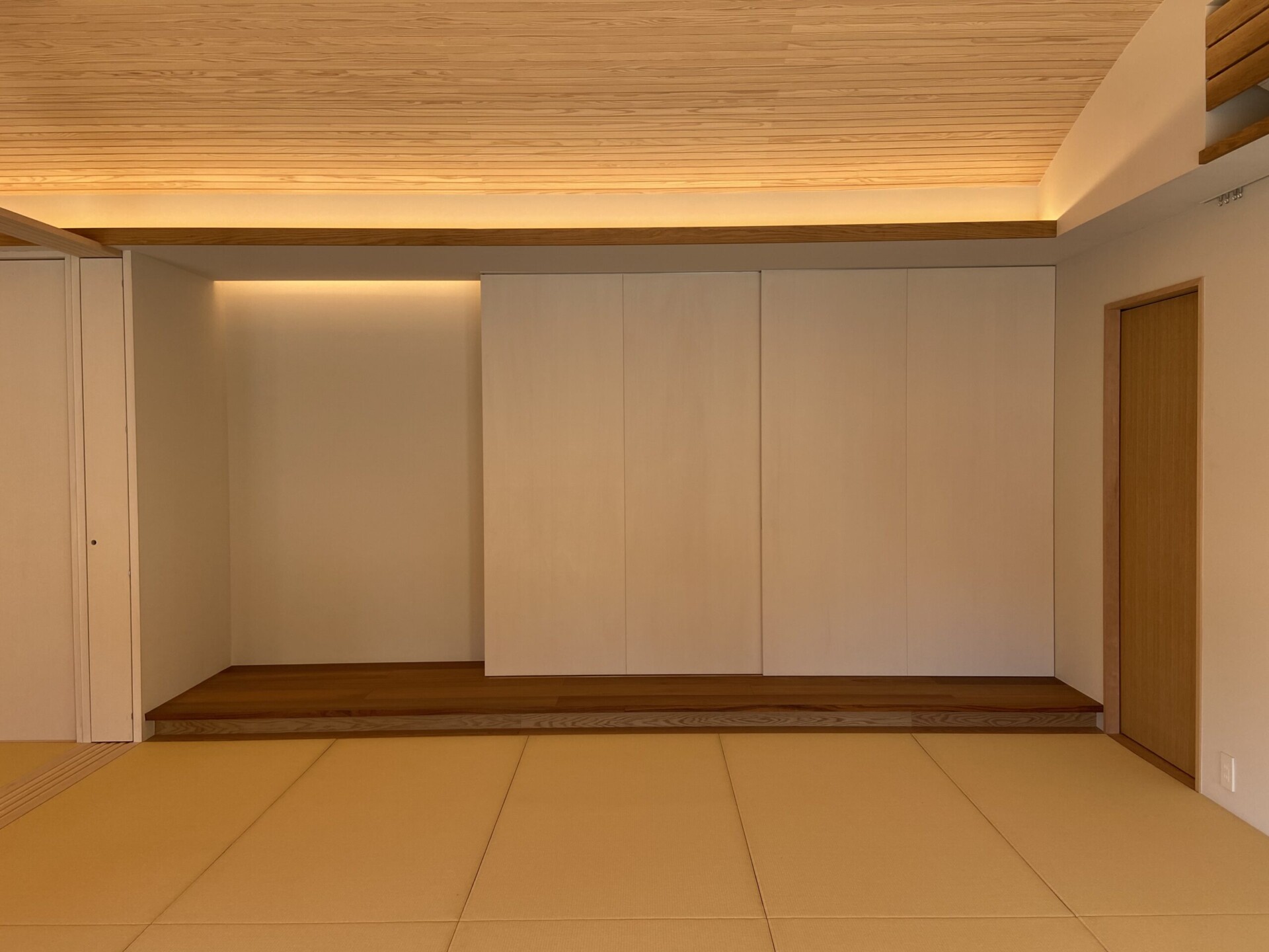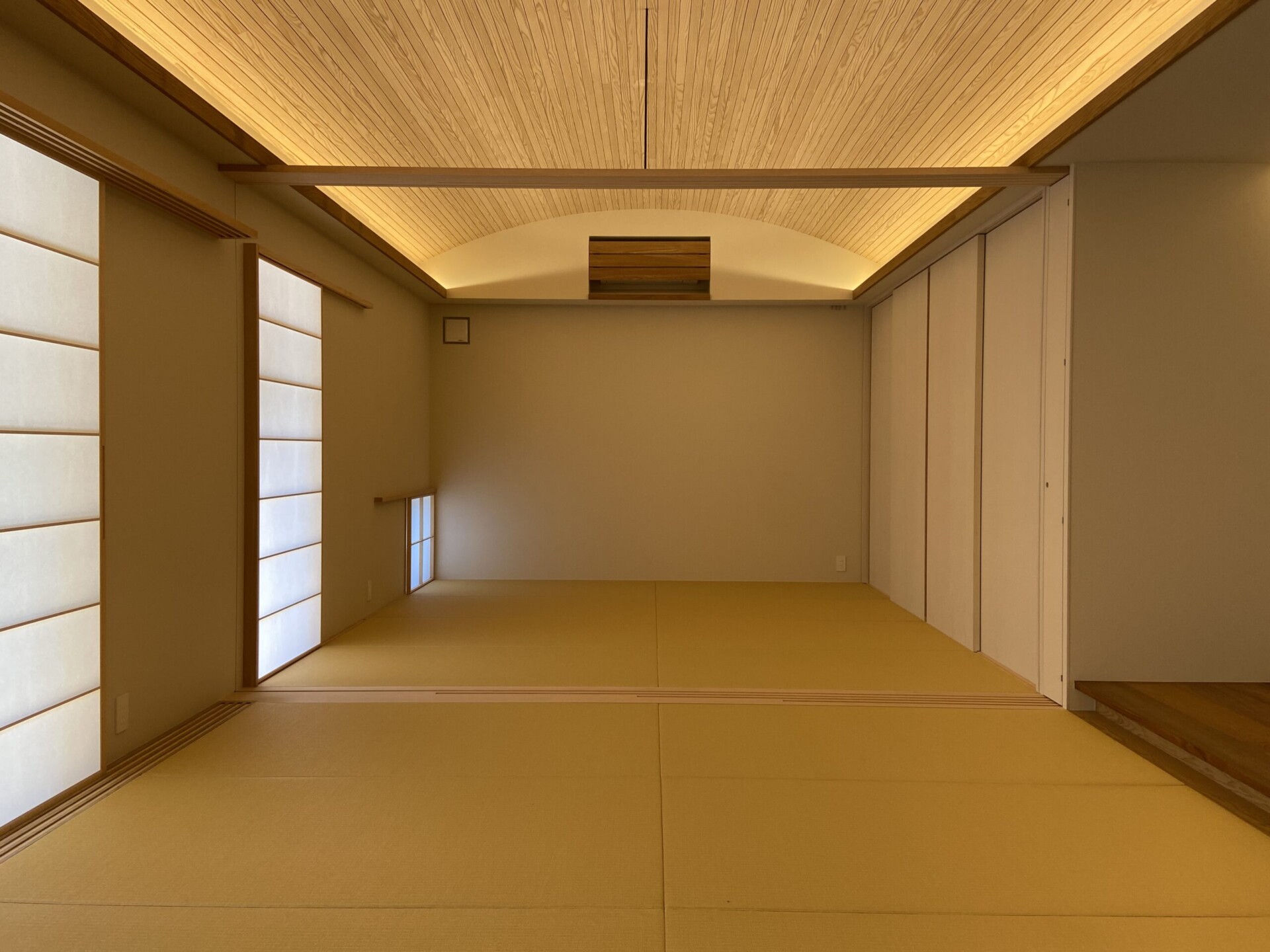 玄関の正面壁には熊野桧に鋸目を入れた羽目板を、また天井には熊野杉(白太/ 源平)を小幅に挽いた特注製材を使用した。和室の天井は曲面張りとしているが、実加工に工夫を凝らして頂き、光がなめらかに回り込む美しい曲面を実現することができた。