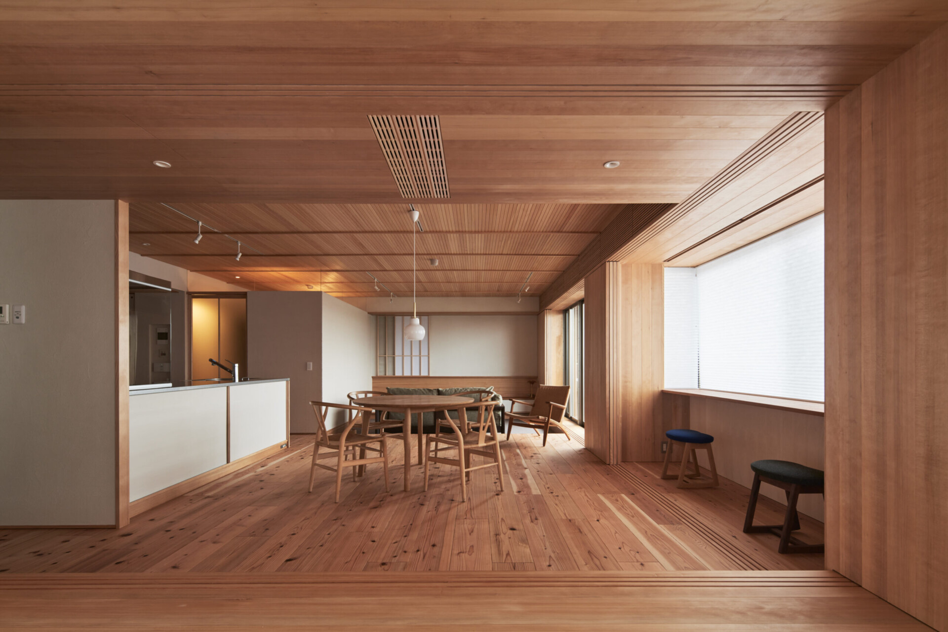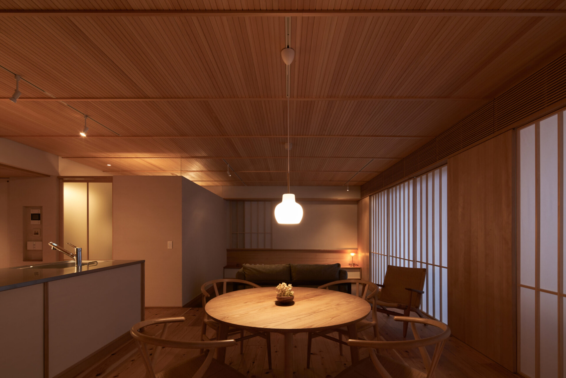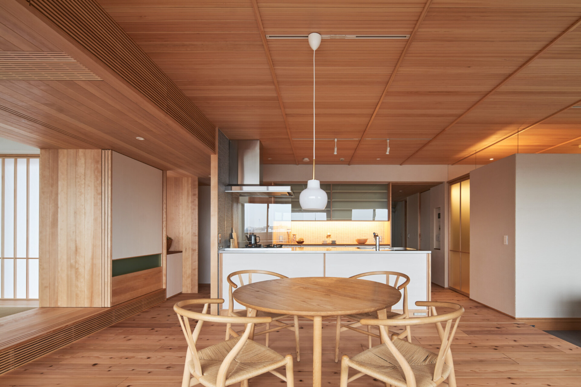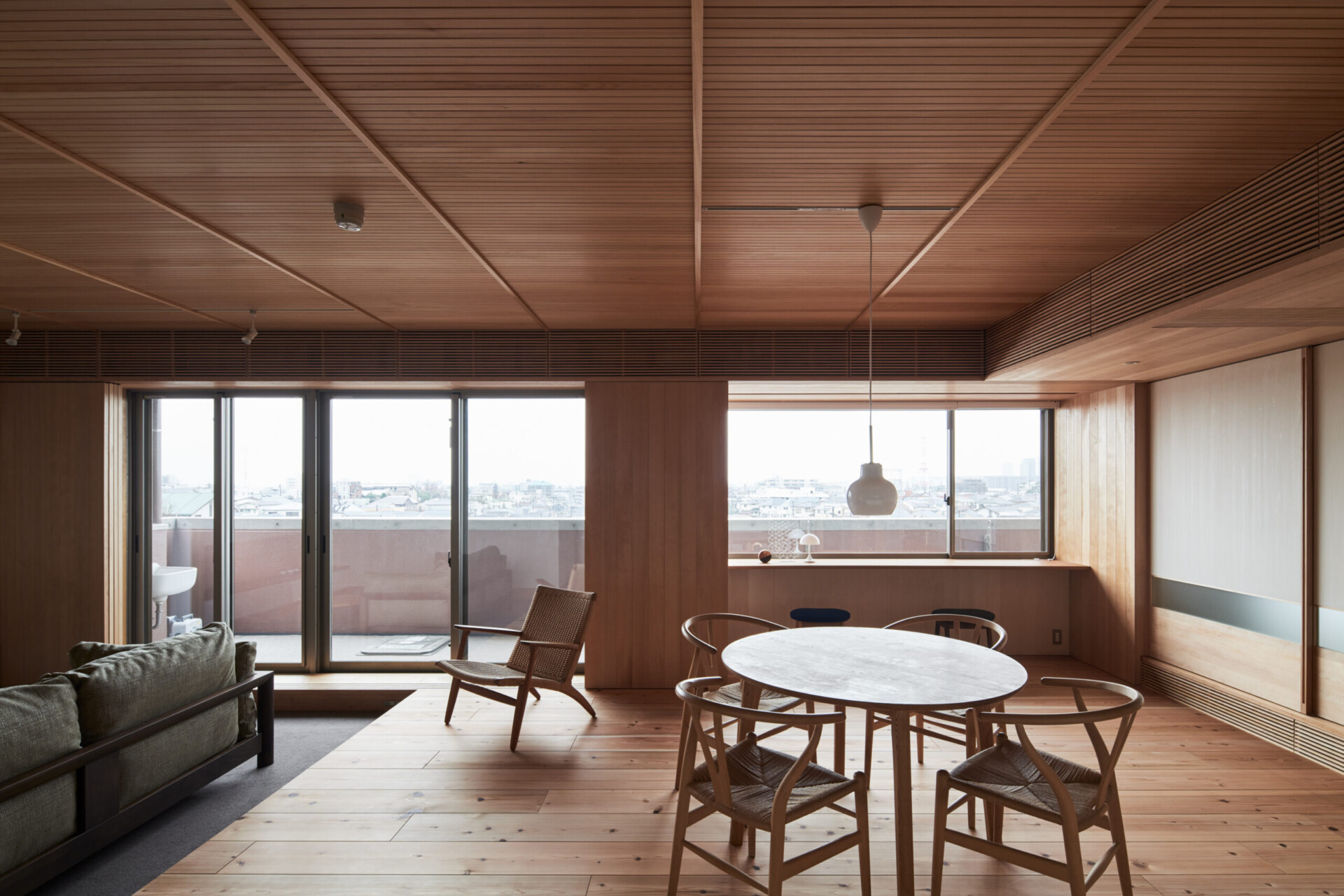 東京都大田区、下町の高級住宅街に建つ低層マンション最上階のリノベーション。和のイメージを持たれていたクライアントに対して単純な和ではなく、北欧と和の調和をうまく表現できないかと試みた。玄関まで一枚で繋がるリビング天井にはヒノキ小幅板を柾目使いし、大きなピッチの押縁で見切ることでリズムを持たせつつ空間の質を高める工夫をしている。