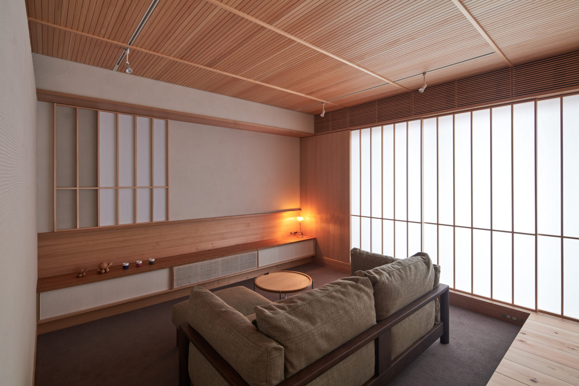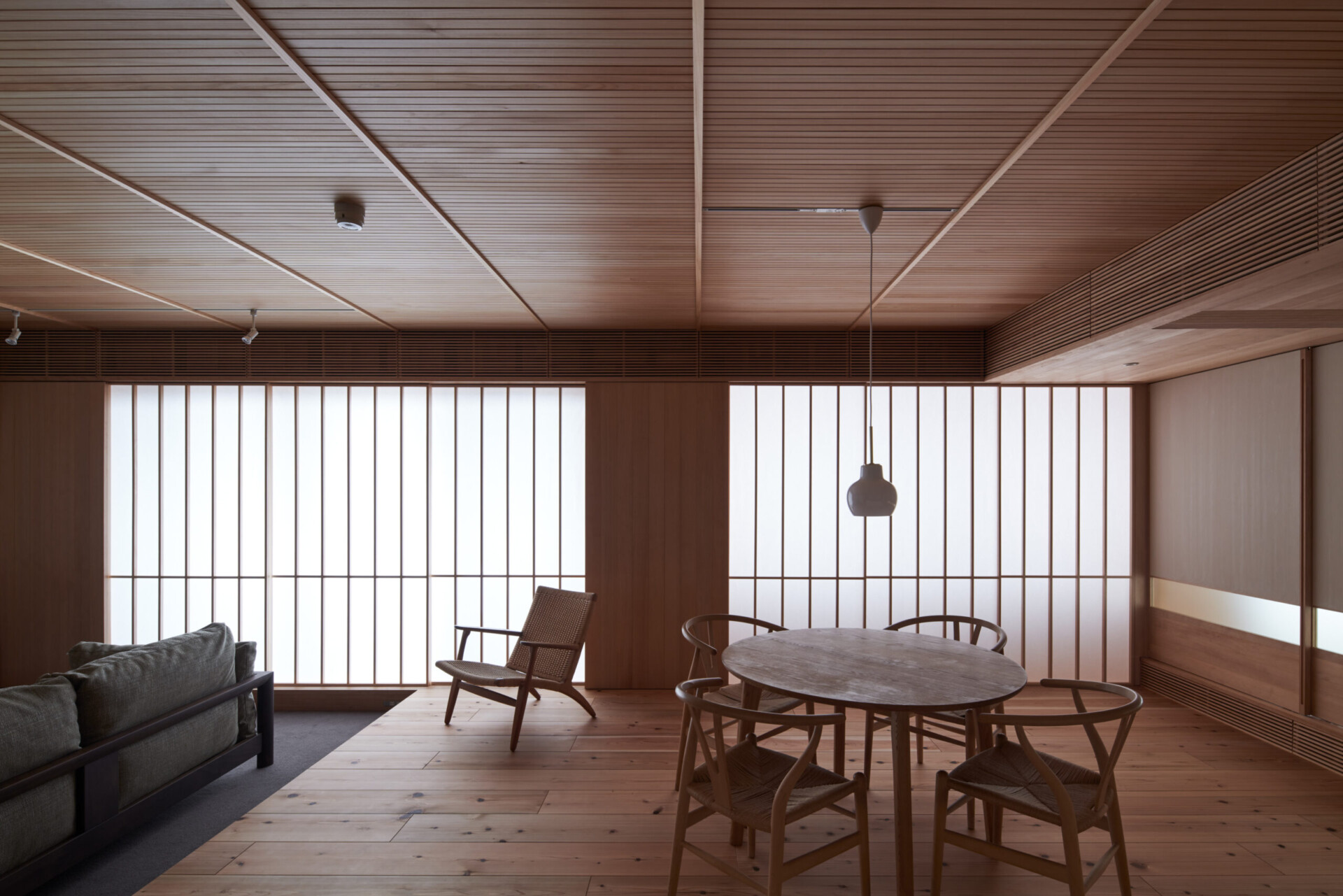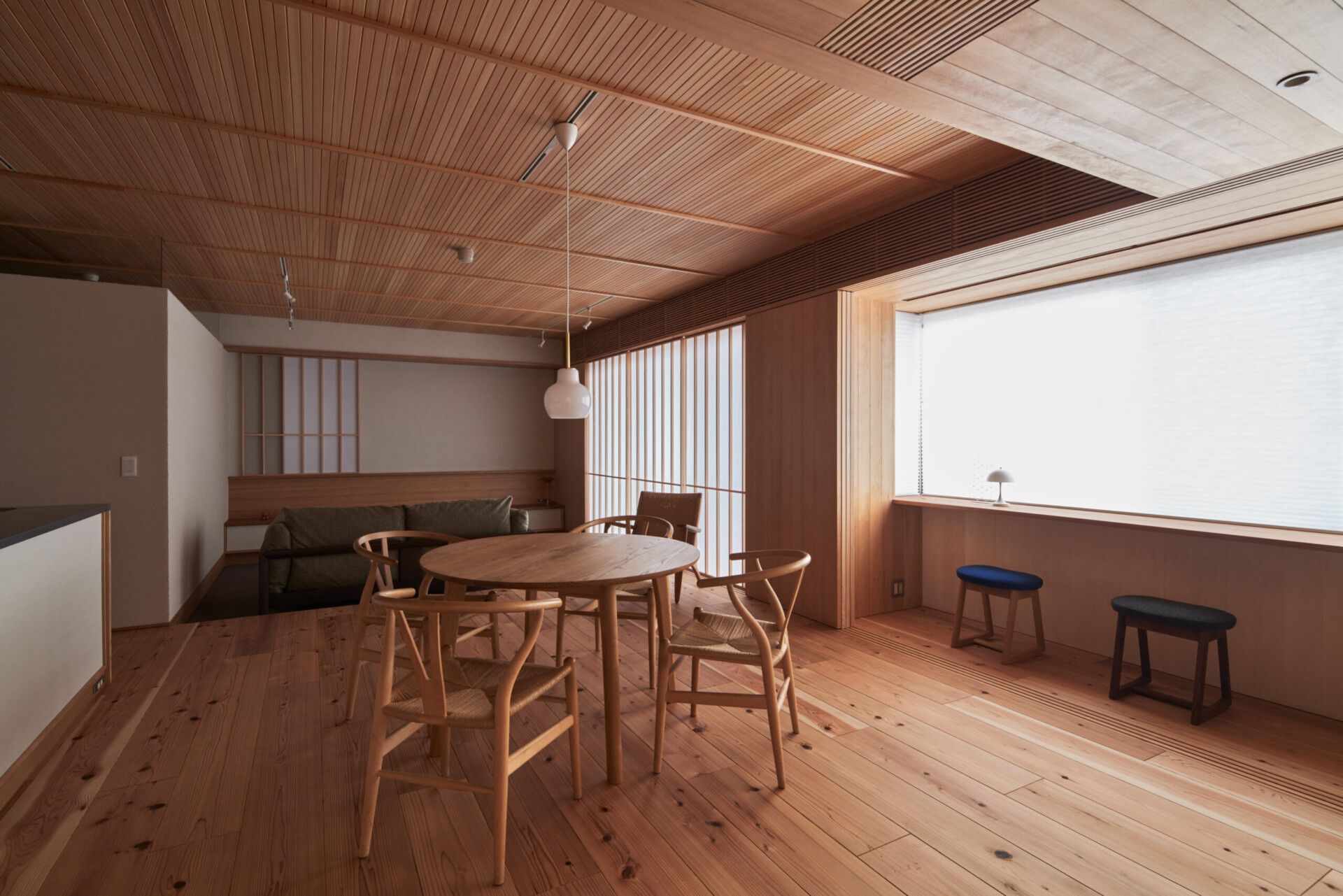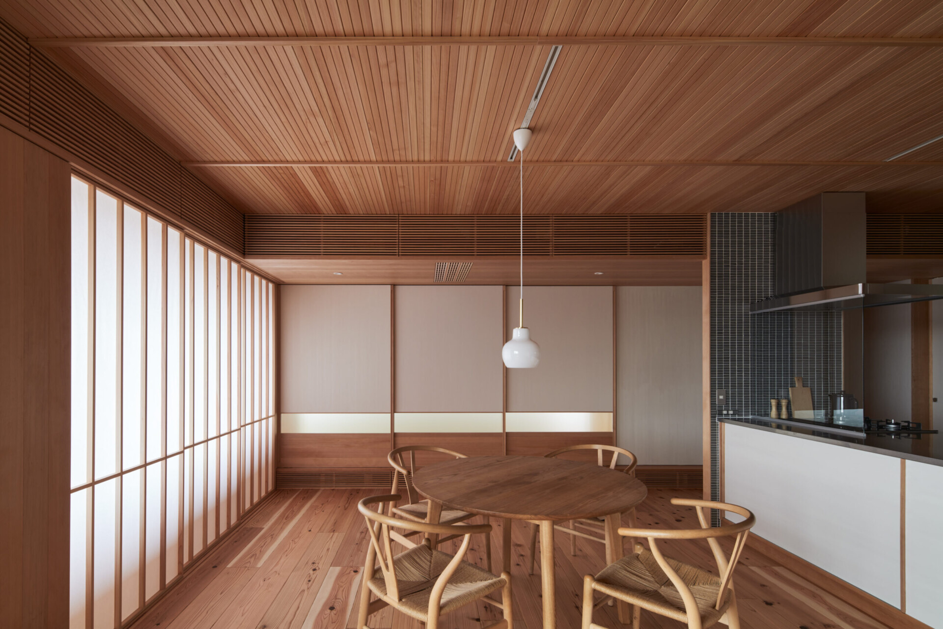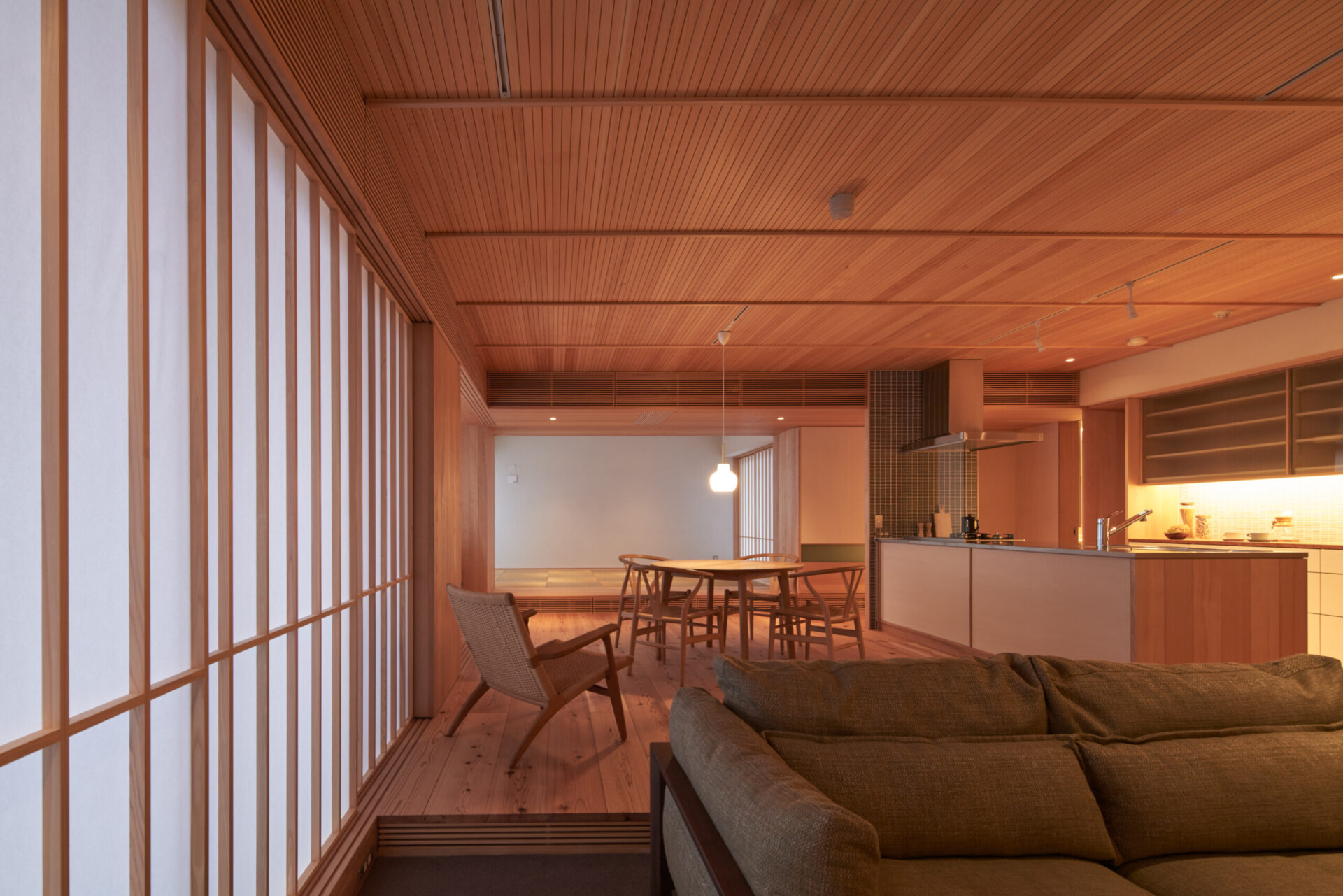 東京都大田区、下町の高級住宅街に建つ低層マンション最上階のリノベーション。和のイメージを持たれていたクライアントに対して単純な和ではなく、北欧と和の調和をうまく表現できないかと試みた。玄関まで一枚で繋がるリビング天井にはヒノキ小幅板を柾目使いし、大きなピッチの押縁で見切ることでリズムを持たせつつ空間の質を高める工夫をしている。