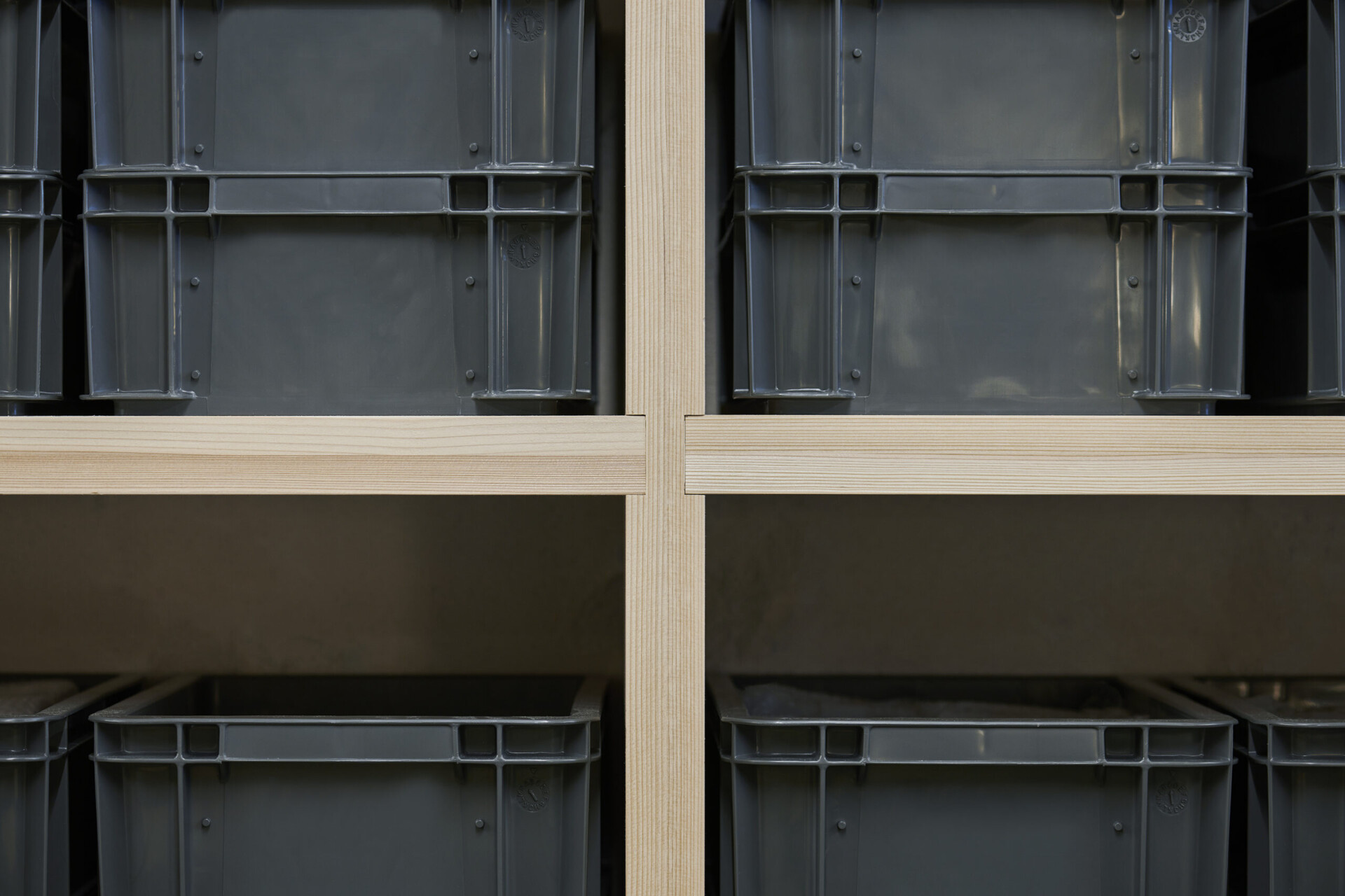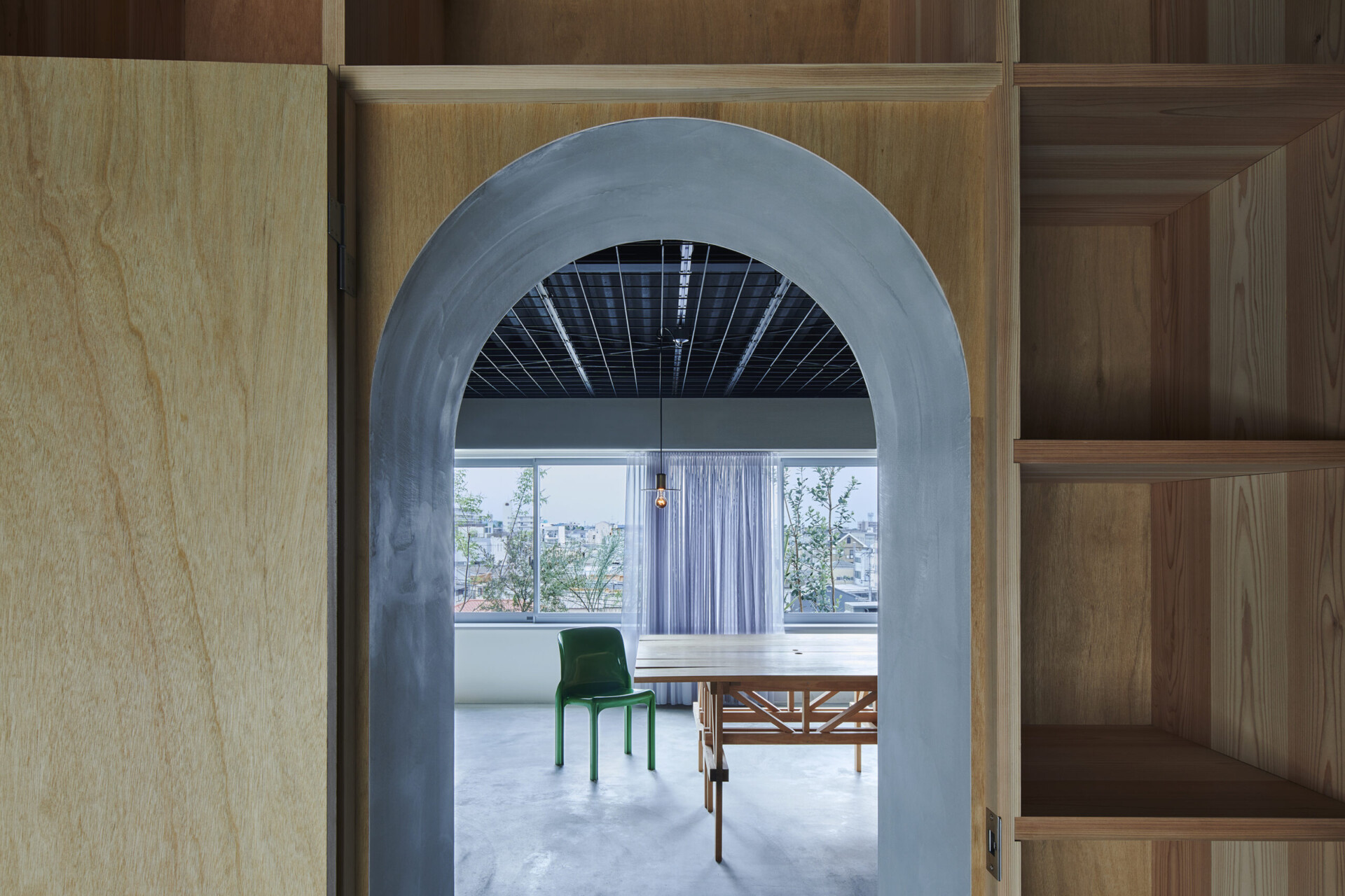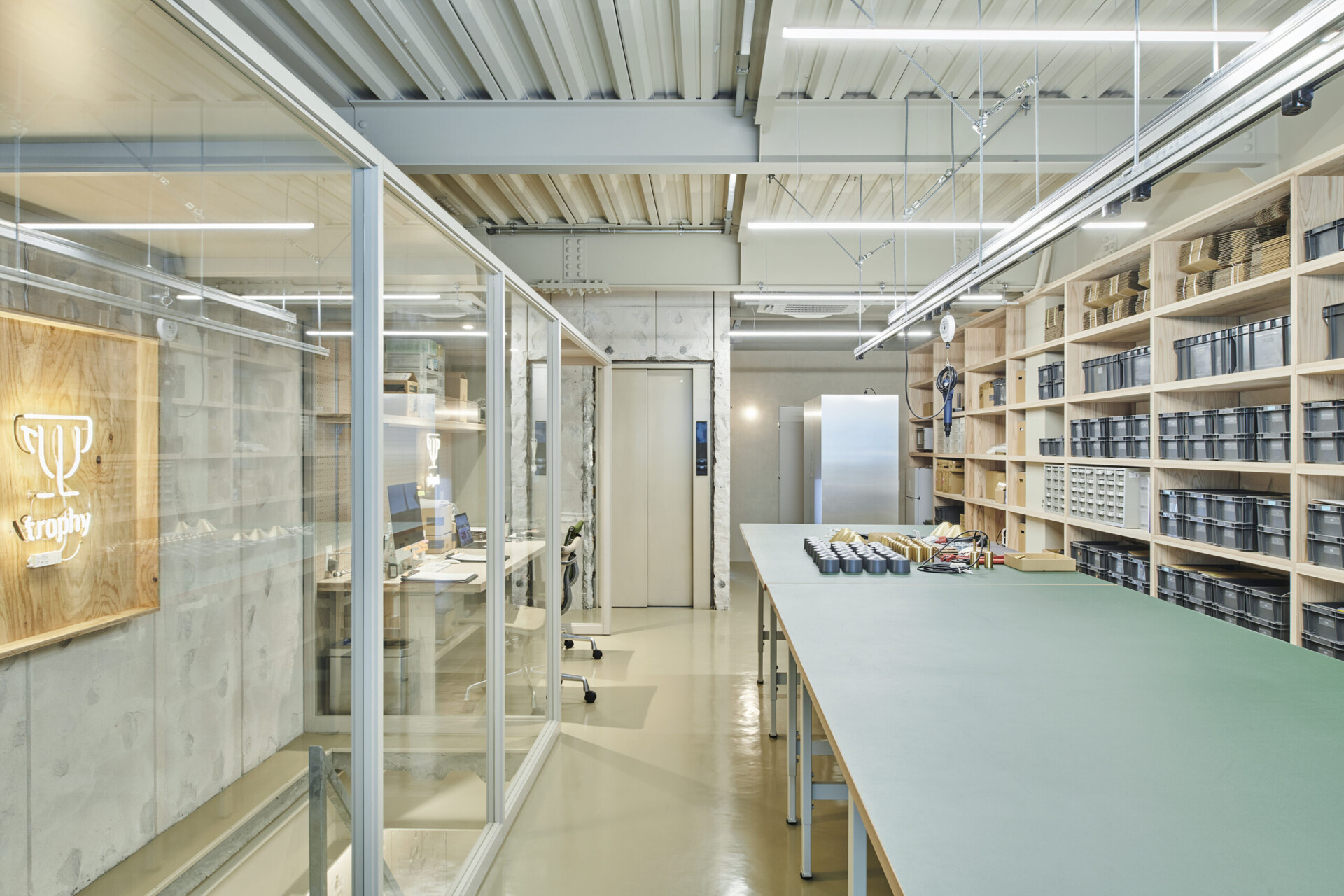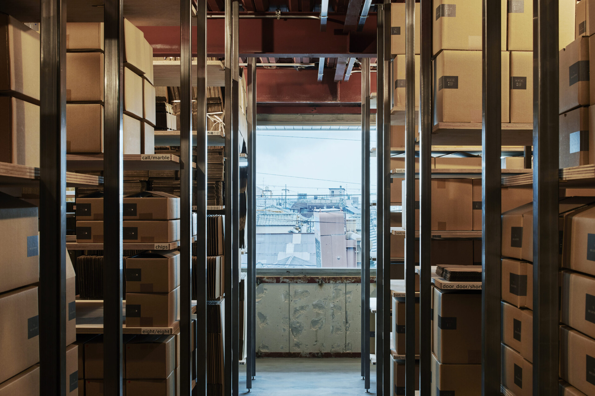 小さな面積が積み重なるビルの特徴を生かしてフロア毎に用途を変え、1階を荷解き場、2階にオフィスと作業場、3.4階は倉庫、5階をフォトスタジオとし、屋上にはデッキを敷きルーフトップテラスを設けた。