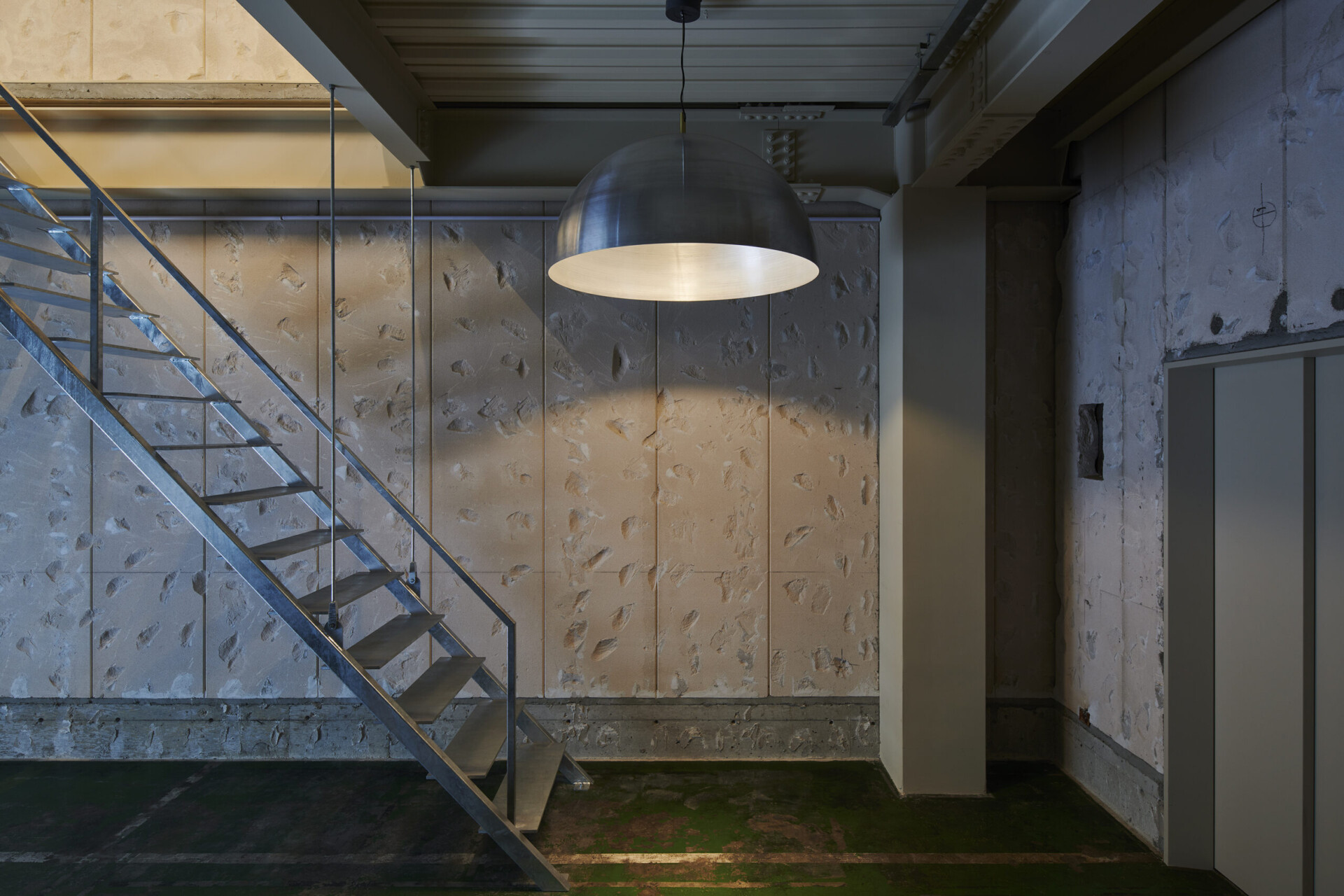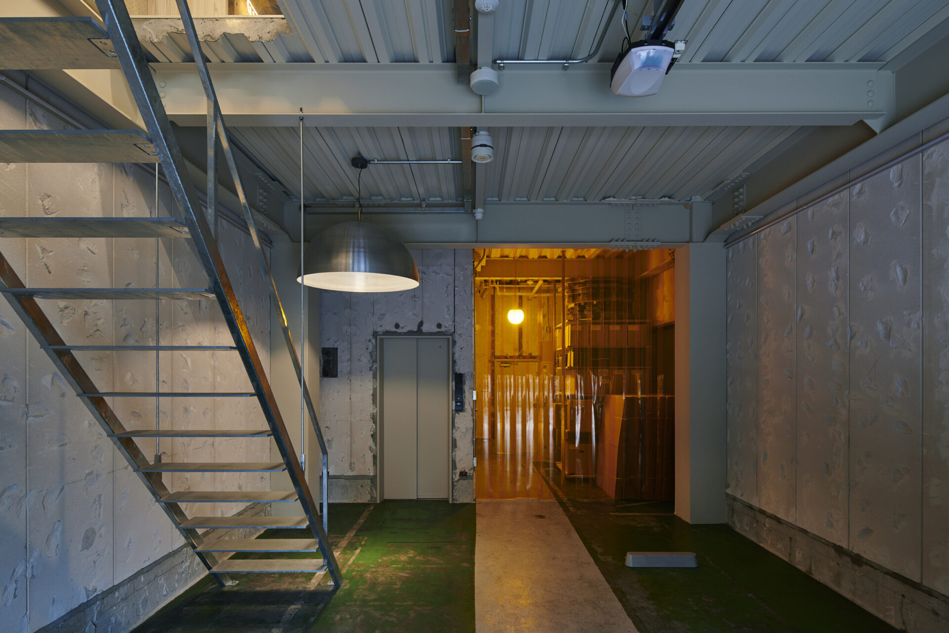 1階には階段を増設して動線を強化し、隣に浮かぶアルミの照明器具とシンクロするように側桁を溶融亜鉛メッキとした。