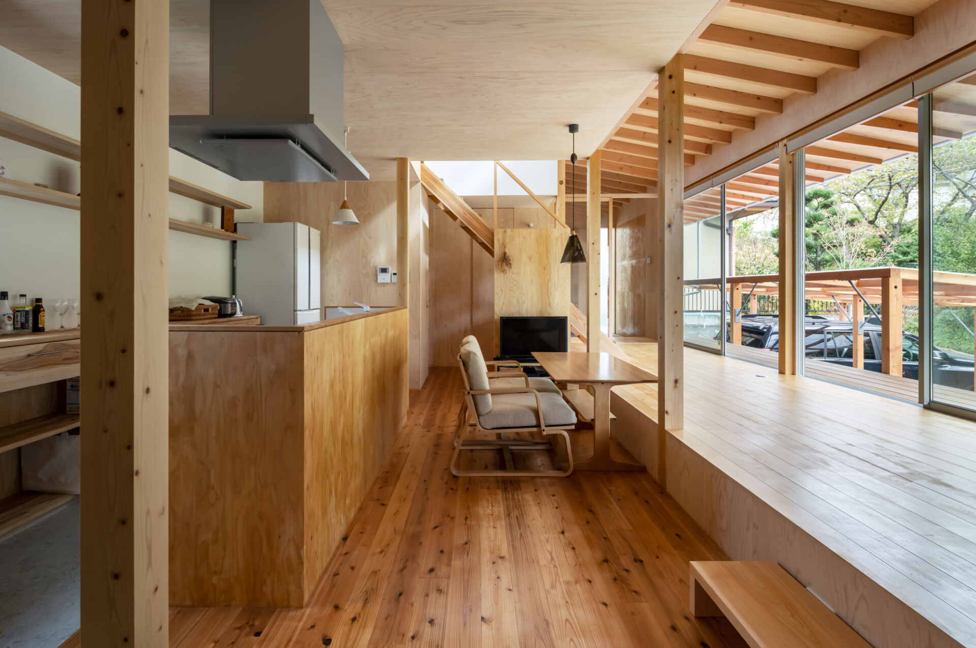 また、景色=環境を取り込むという考えを視覚だけではなく、住まい手が五感で感じられるよう、内部空間には木材などの自然素材を出来るだけ使用しました。エンガワは伝統的な縁側より幅が広くリビングのような空間で、座ったり寝転んだりするため、肌触りの良いヒノキフローリングとしています。濡縁(外部の縁側)やダイニングキッチン、寝室や階段は温かみのあるスギフローリングとしました。