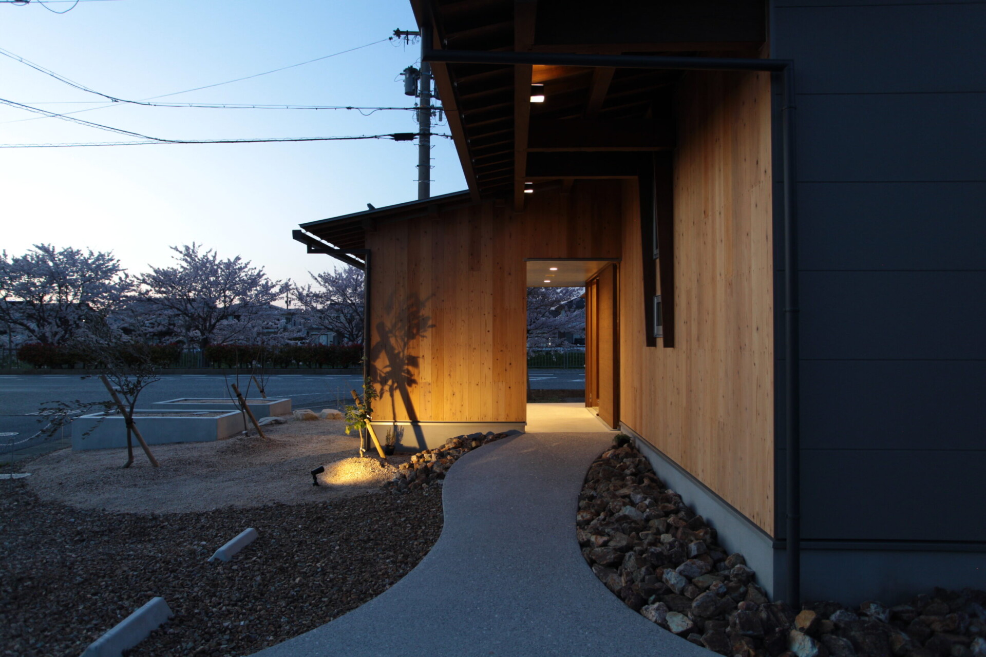 外壁には経年変化を楽しめる自然素材を使いたいが将来のメンテナンスも気になるというクライアントに、水に強くて耐久性に優れる赤身の熊野杉を提案した。