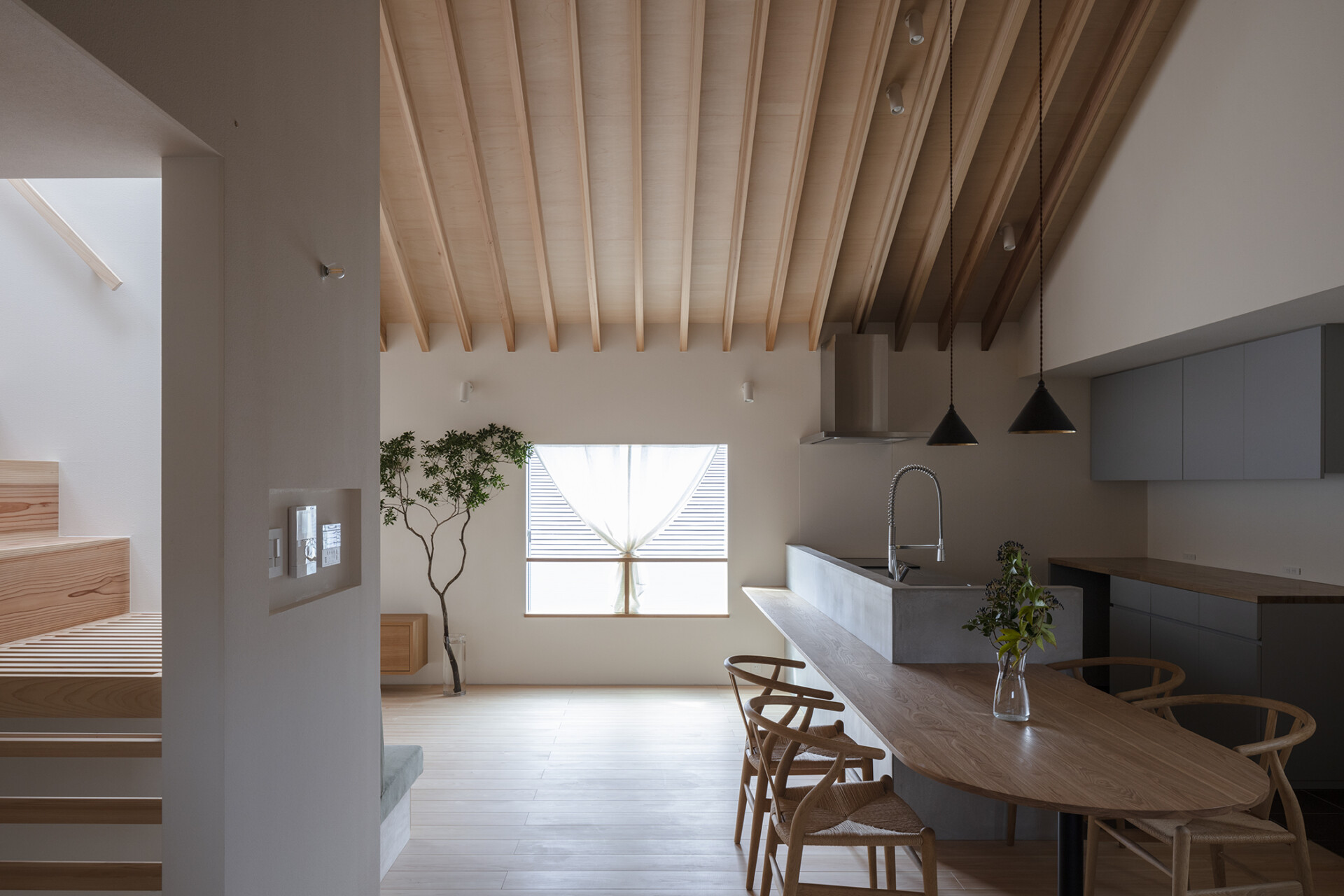また、皆んなが集まるリビングは、三角屋根の連続する美しい杉の梁が優しく包みこみ、リビングから繋がる小さなテラスの先に見えるアオダモの青葉や落葉していく様を毎年楽しみに、庭が無くても四季の移ろいをちゃんと受け止められるようにした。