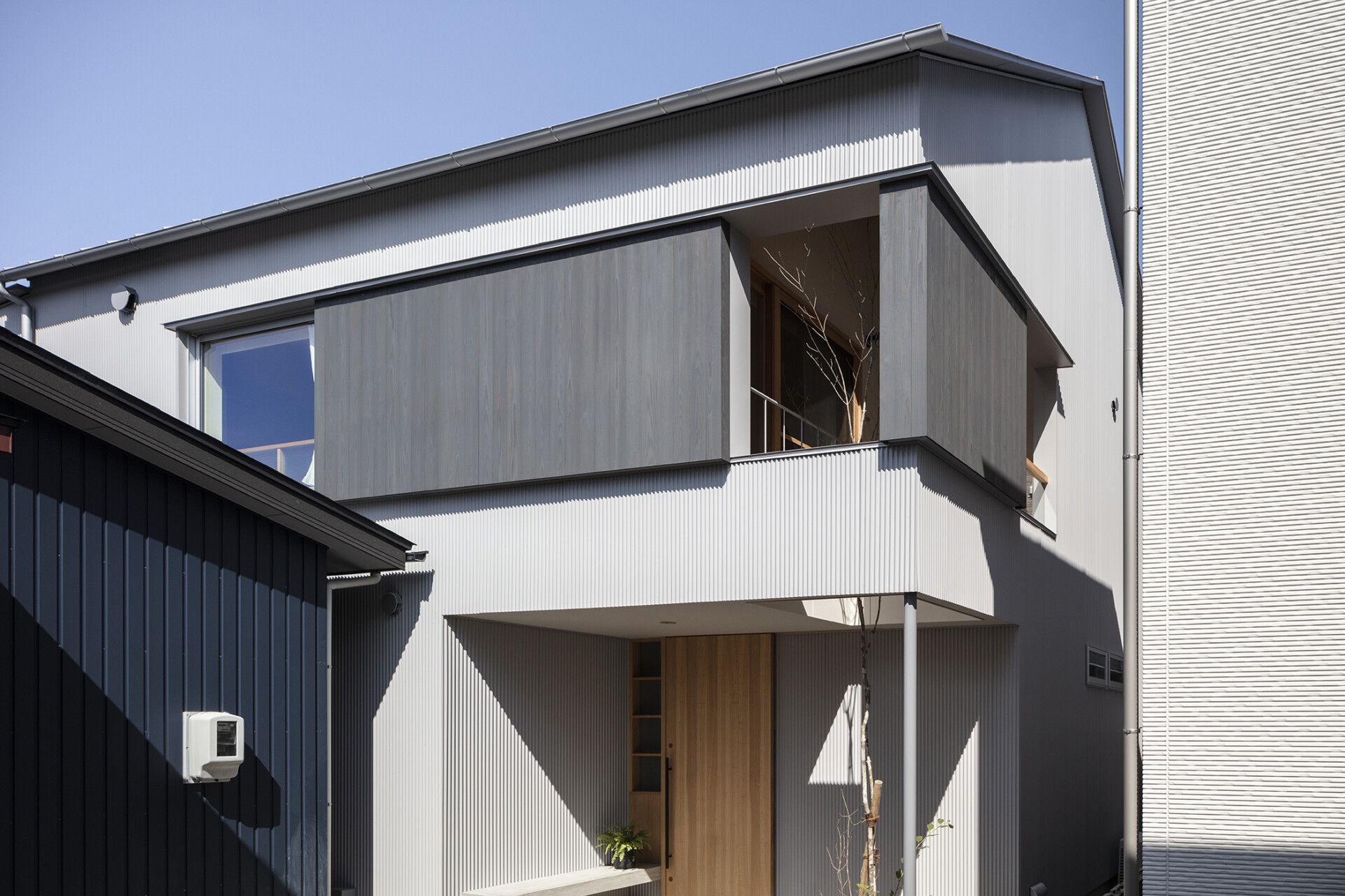 住宅で囲まれた旗竿敷地に建つこの家は、街中にひっそり佇んでいる。ご家族のご要望は、ご友人達が集まれる家、そして漆喰や木などの自然素材を感じられる家。