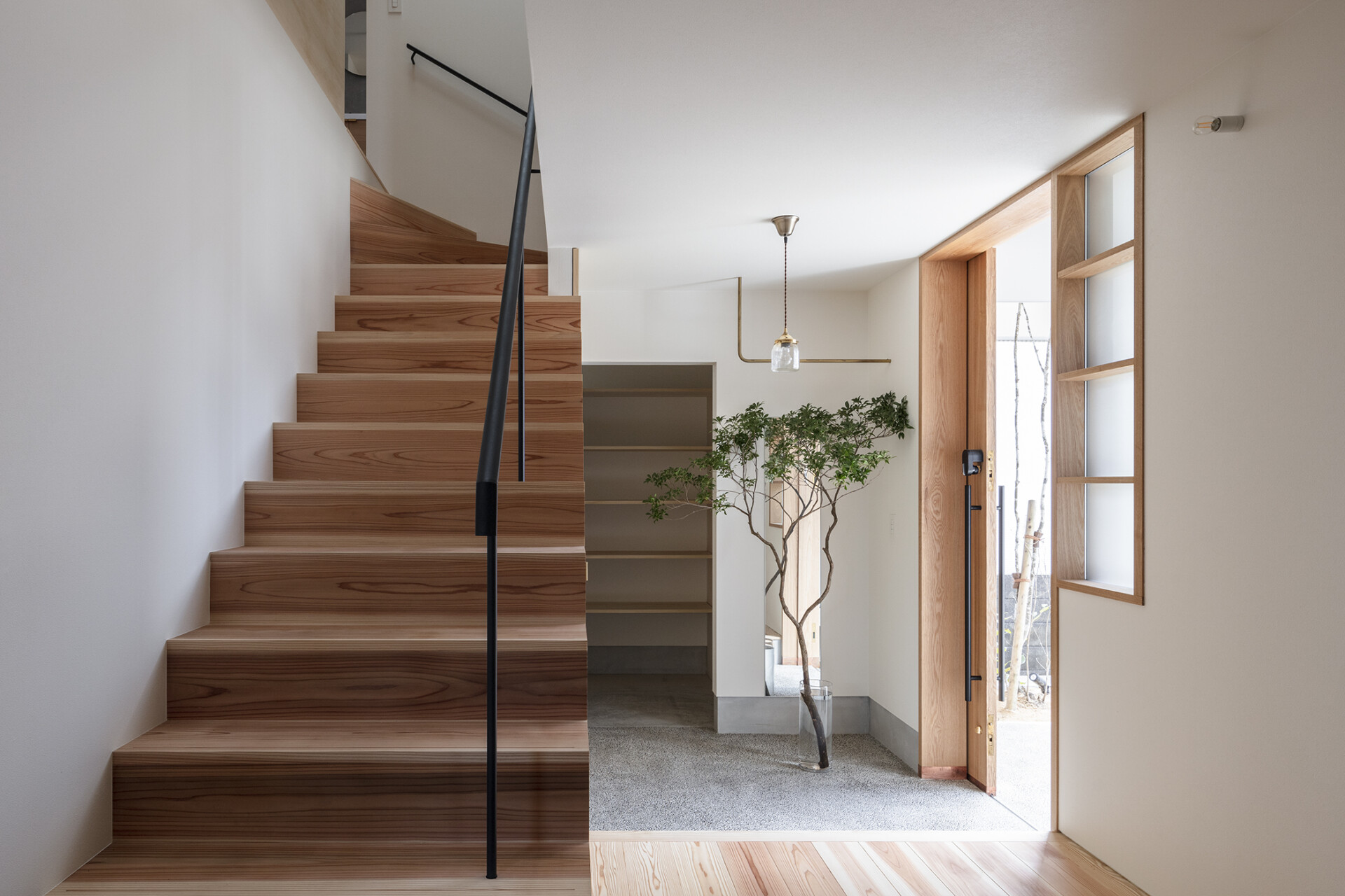 まず、玄関ポーチはベンチを設けることで友人達と話せるような憩いの空間にもなり、そこから見える植栽スペースに植えたアオダモの木は、吹抜けを通して2階テラスへ、そしてリビングへと繋がる。2階にあるリビングと玄関の憩いのスペースが吹抜けを通して繋がるように設計した。