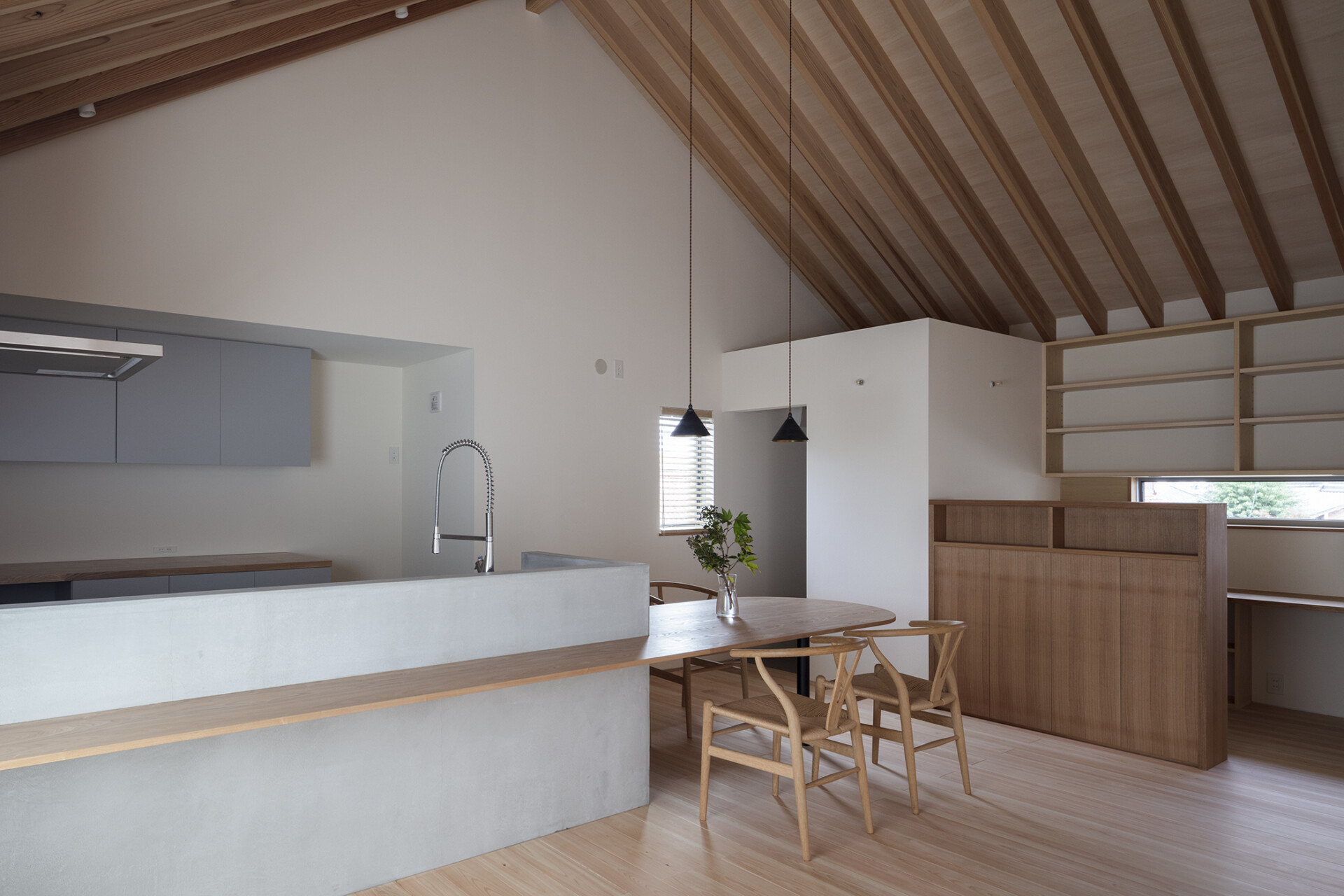 壁は漆喰、床は檜と自然素材で囲まれた空間で、この家のために設計した大きなテーブルをご友人達と囲いながら、毎日の日々を楽しみ、素敵なお施主さまの生活にそっと寄り添うような家になってもらいたい。(安藤建吾設計事務所)