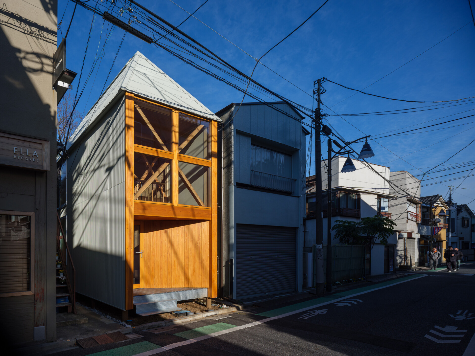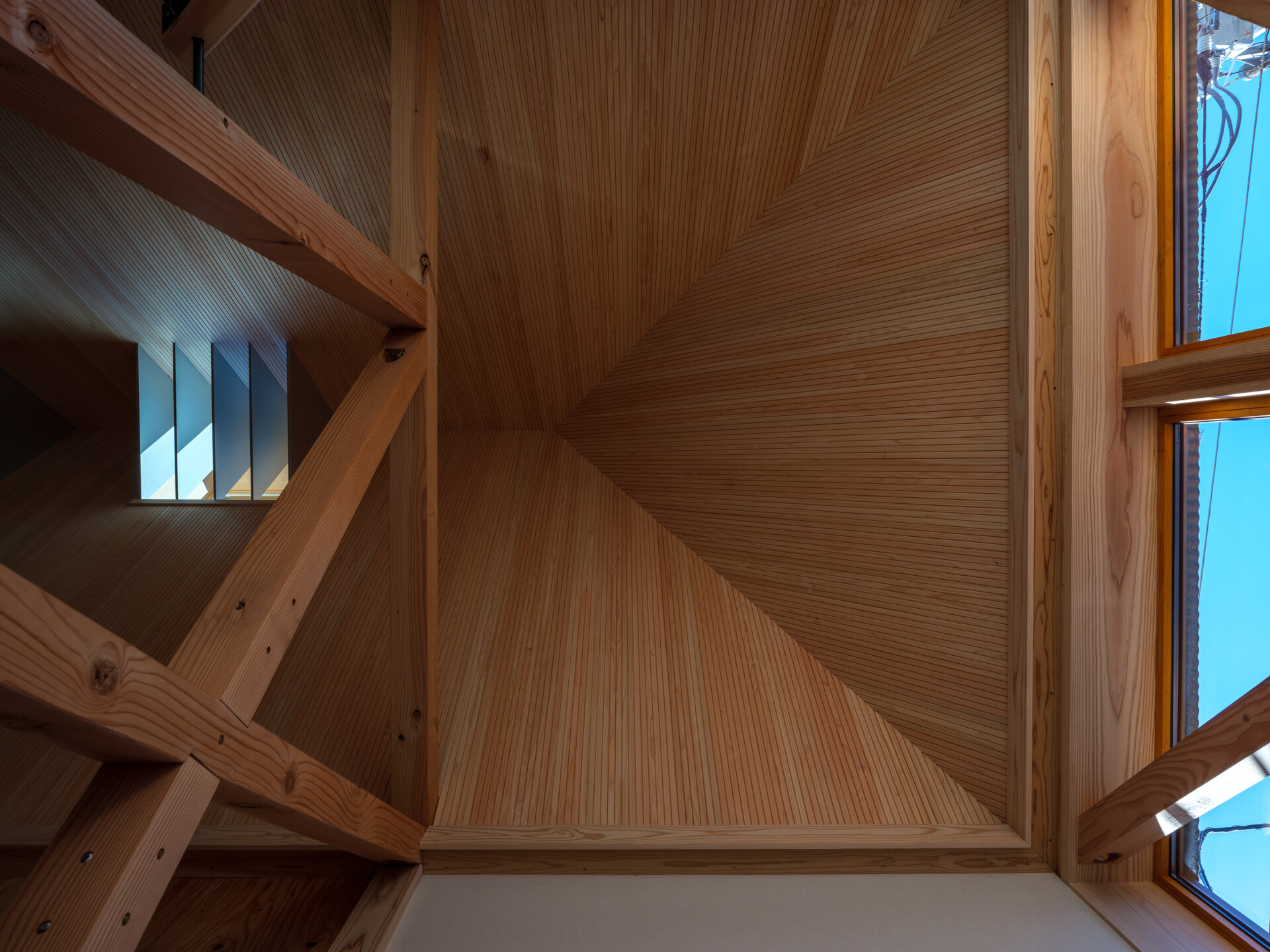 店舗のテナントで2階の勾配天井だけ仕上げることになり、トンガリ屋根の天井の美しい素材を探していました。急勾配の天井に檜の板材を使いたいが、羽目板の幅で目地が出てしまい隅部のおさまりが難しく、小幅板風羽目板によって細かい目地が連続することで板の幅が目立たなくなり、天井が一体的に見せることができました。また小幅板が天窓からの光を受けて反射光と陰影が繊細に見えました。(能作文徳建築設計事務所/能作文徳)