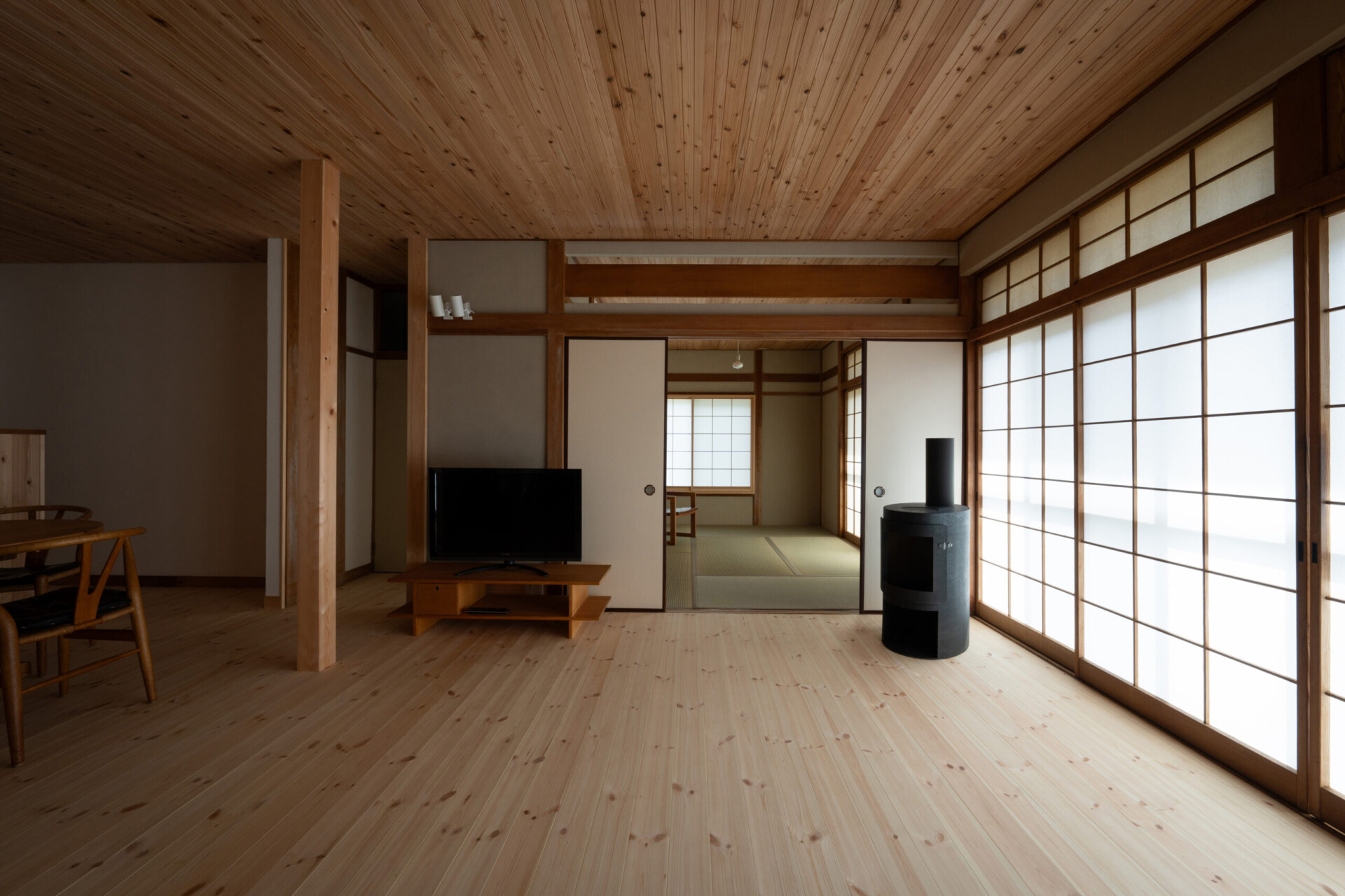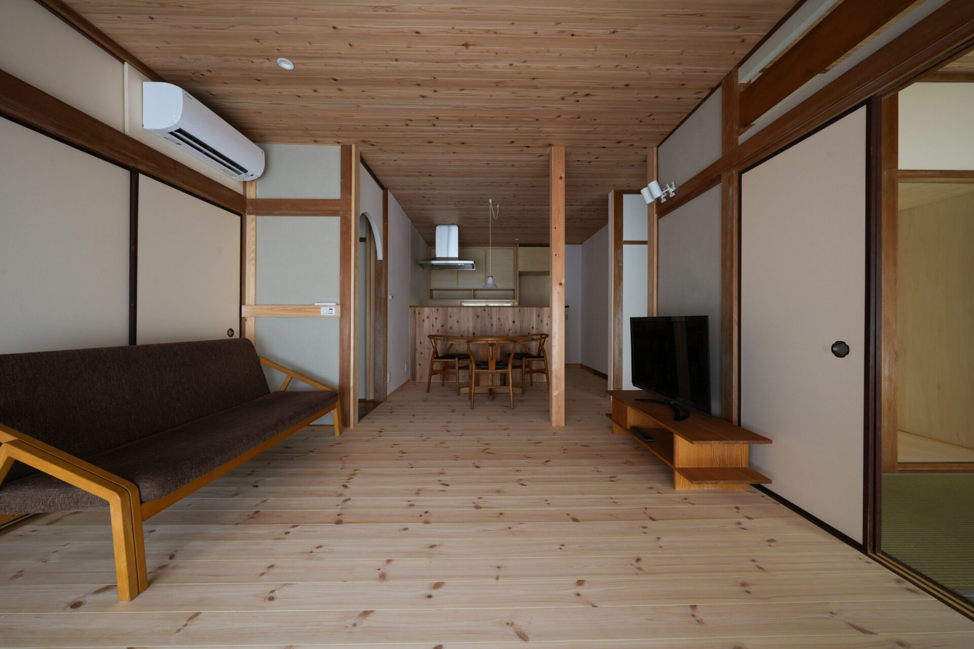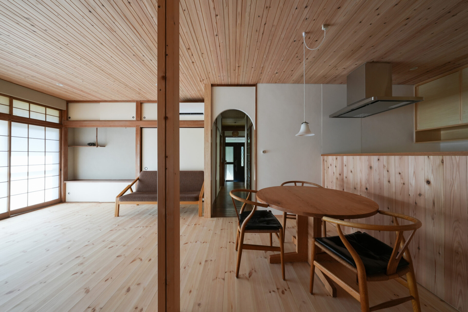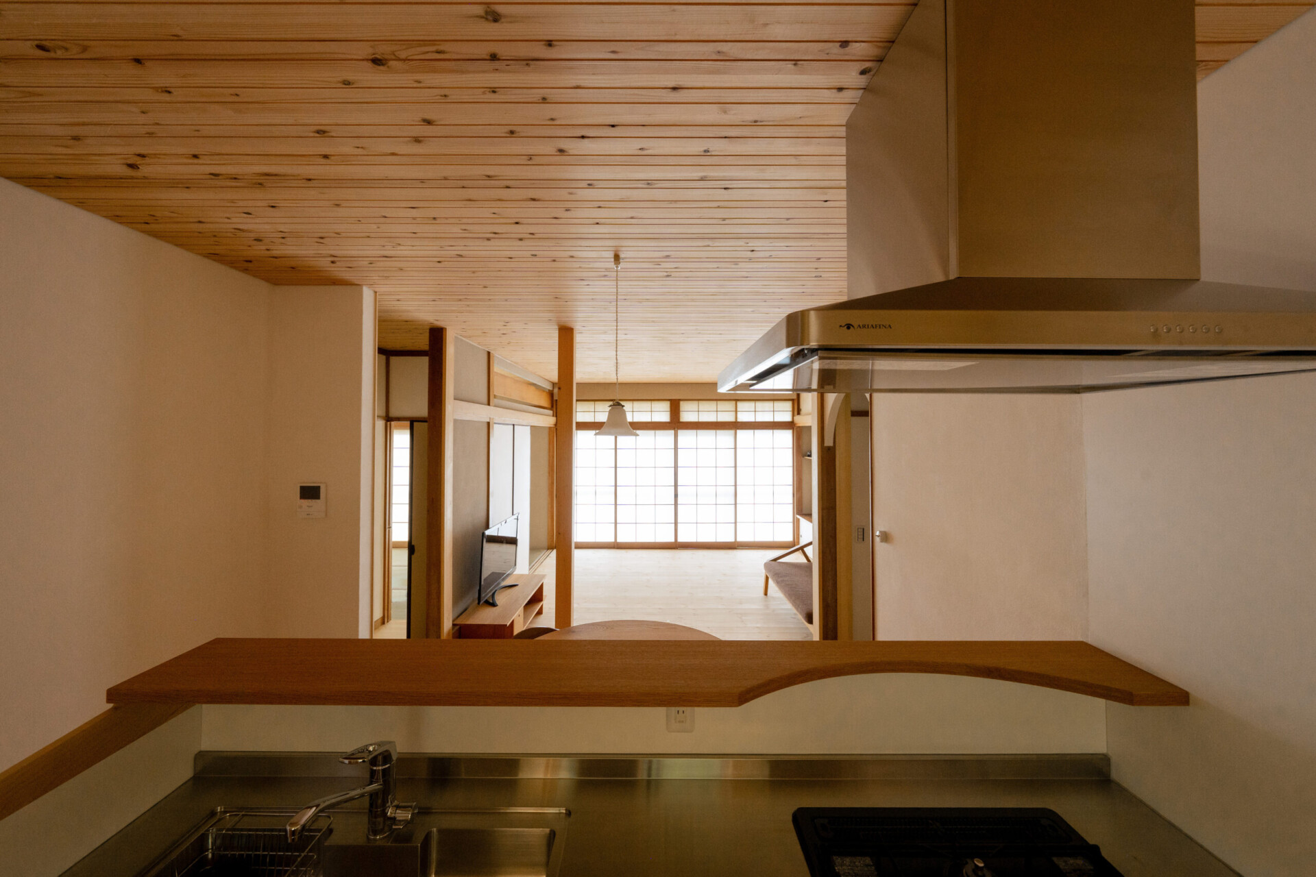 今までのプランは、食堂、台所は下がり壁によって北側の閉じた空間。南側の居間は本格的な和の閉じた空間。その2つの空間をおおらかに繋ぎたい。これまで大切にしていた和の空気感を損なうことが無いよう天井材を注意深く検討した。最終的に選んだ材料は、杉の赤み節ありの羽目板、取り付けは反り止めのノコ目の入った裏使いとした。赤み材が持つ落ち着きと深み、ノコ目から生まれた柔らかな表情によって、まるで何事もなかったように新しい場所となって、うまく繋ぐことが出来たと思う。