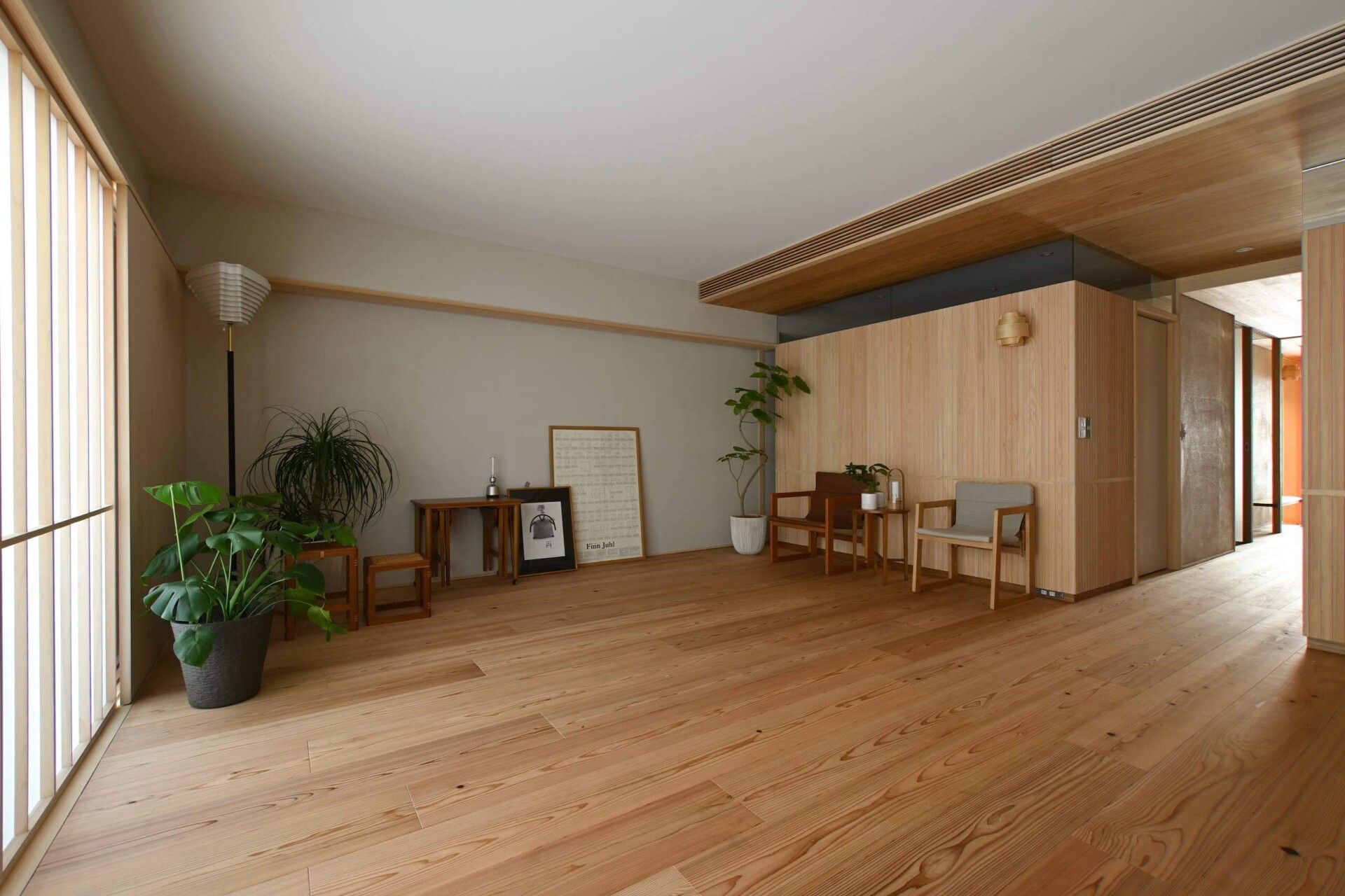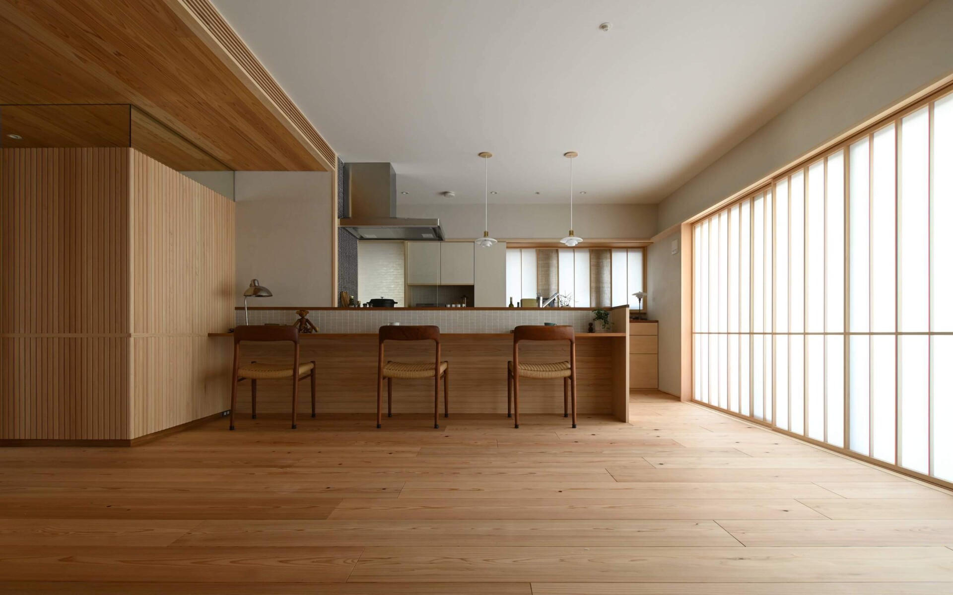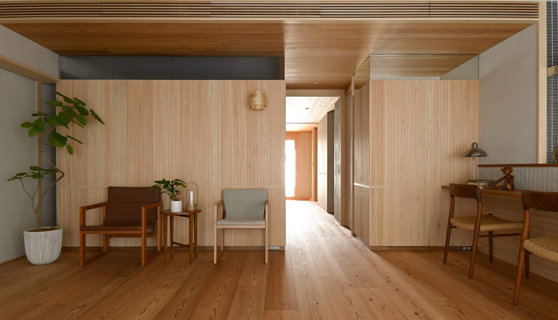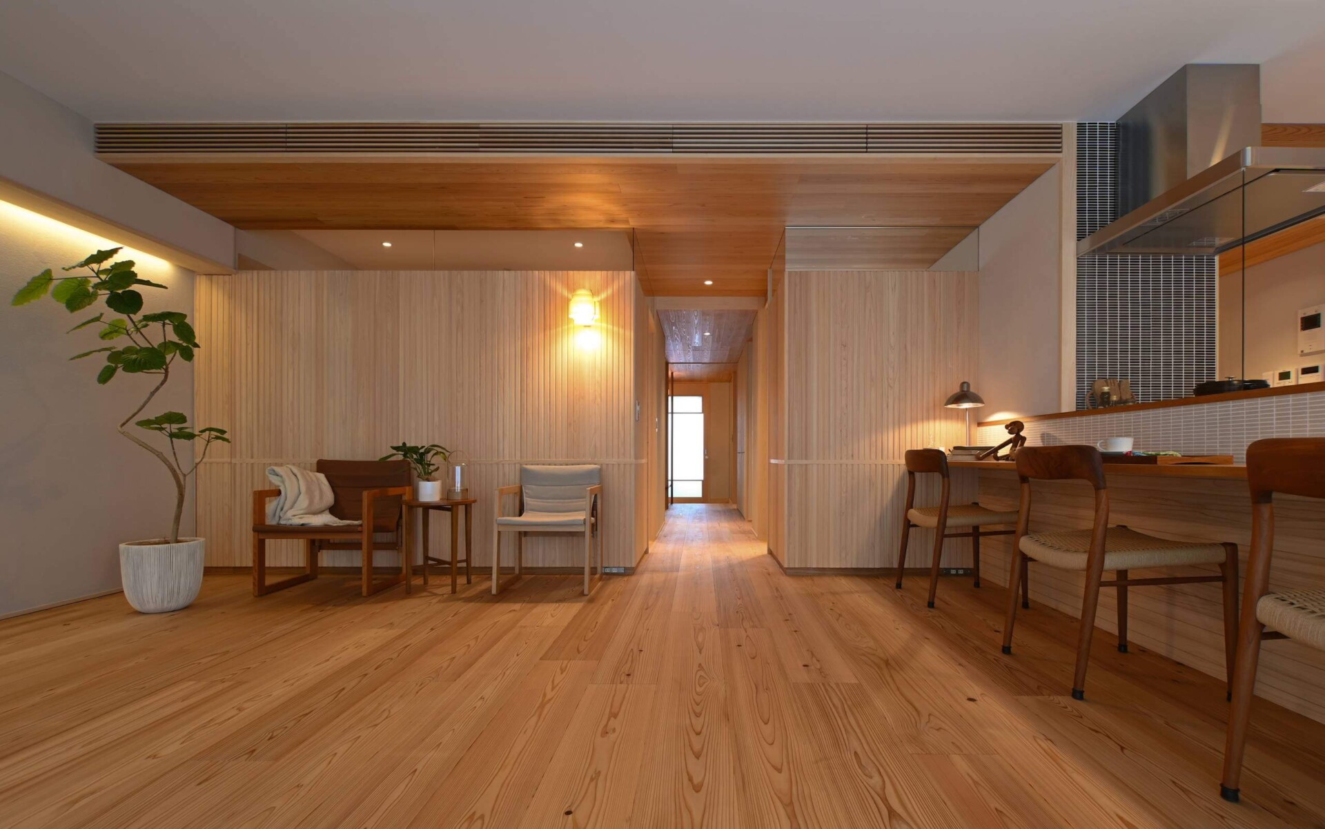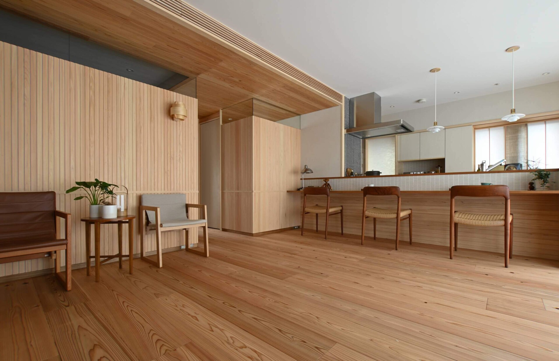 格子風にデザインされた羽目板ですが、実際に施工してみると和風よりになりすぎず、リズミカルで軽やかな印象。桧の優しい色合いや香りを感じる、温かみある空間を演出しています。