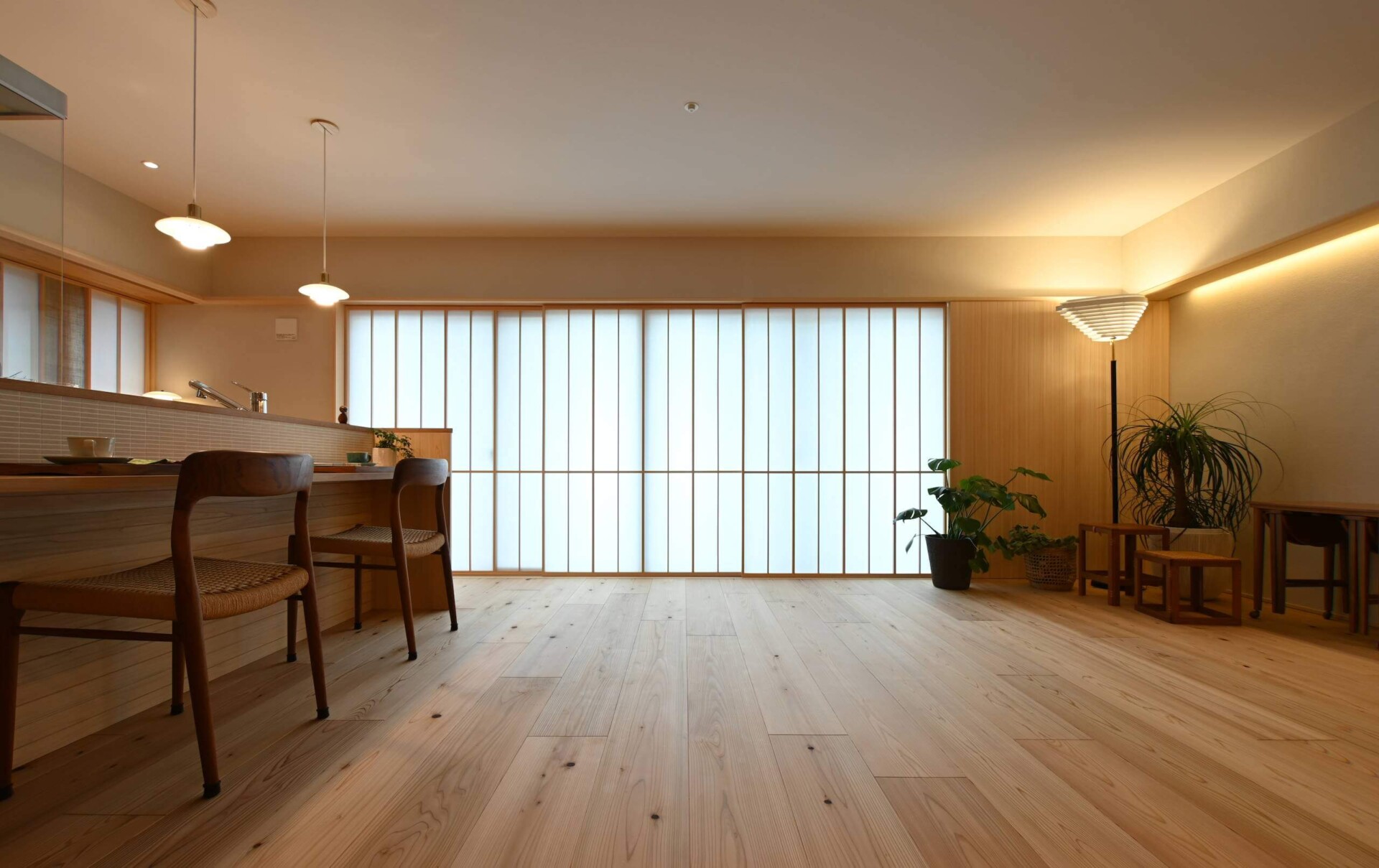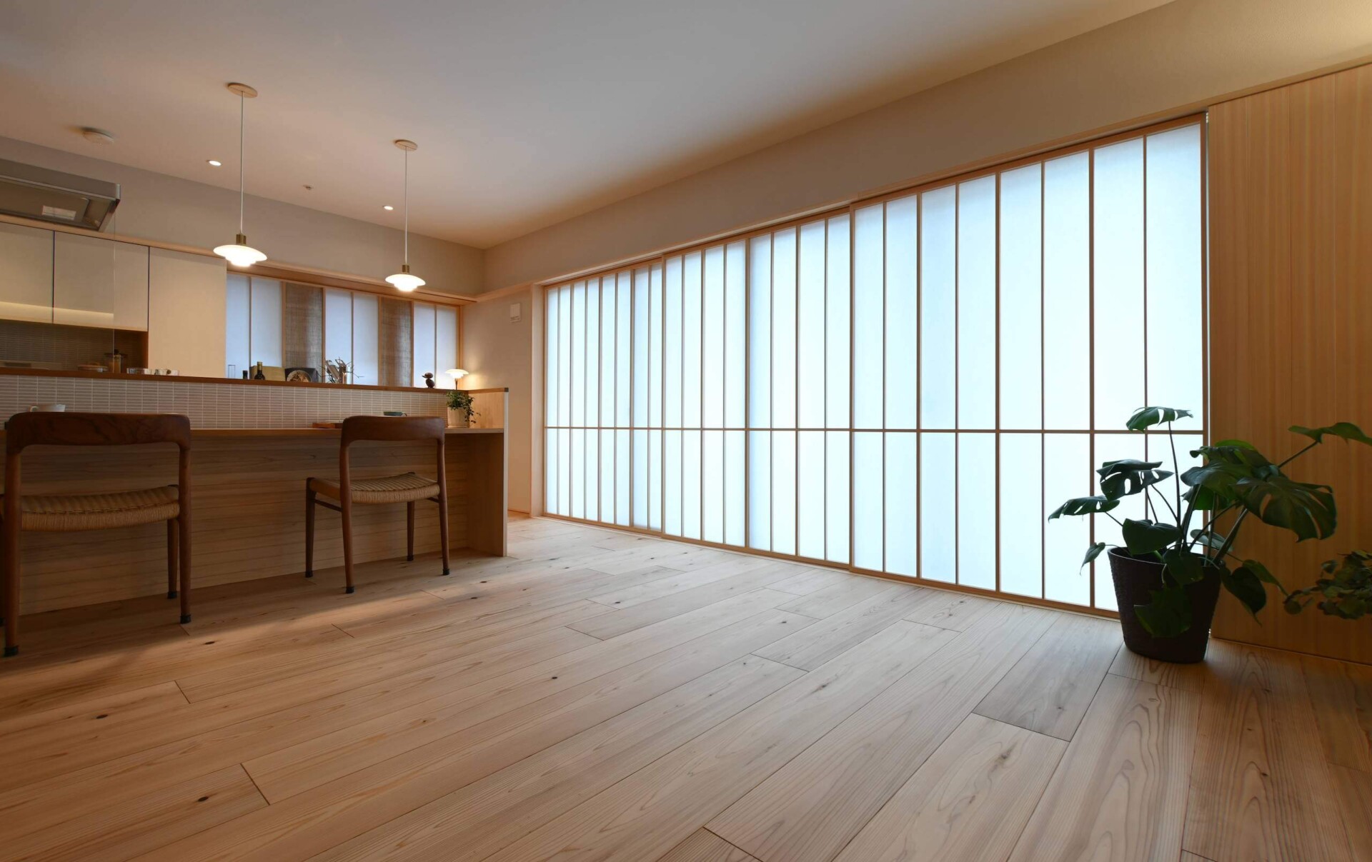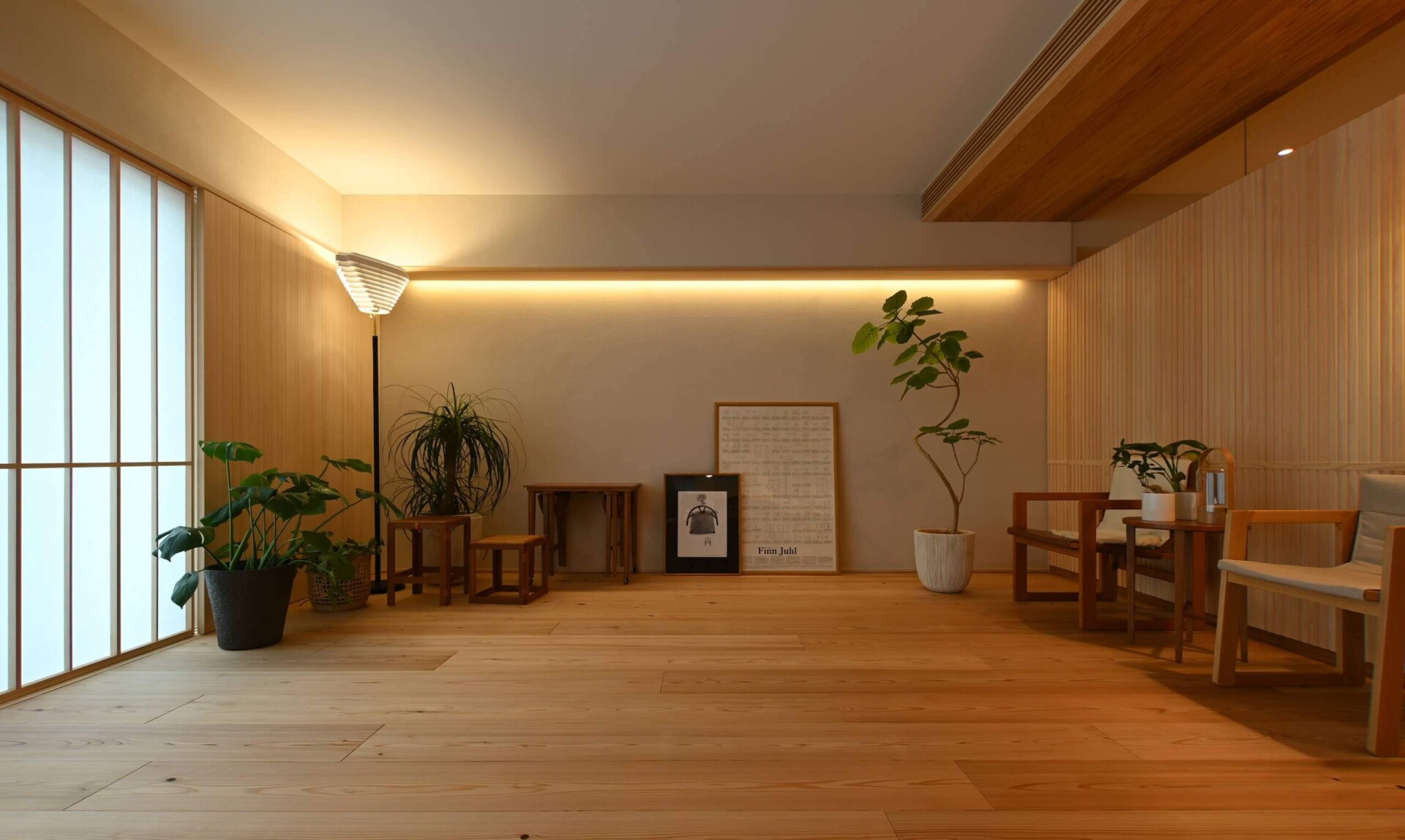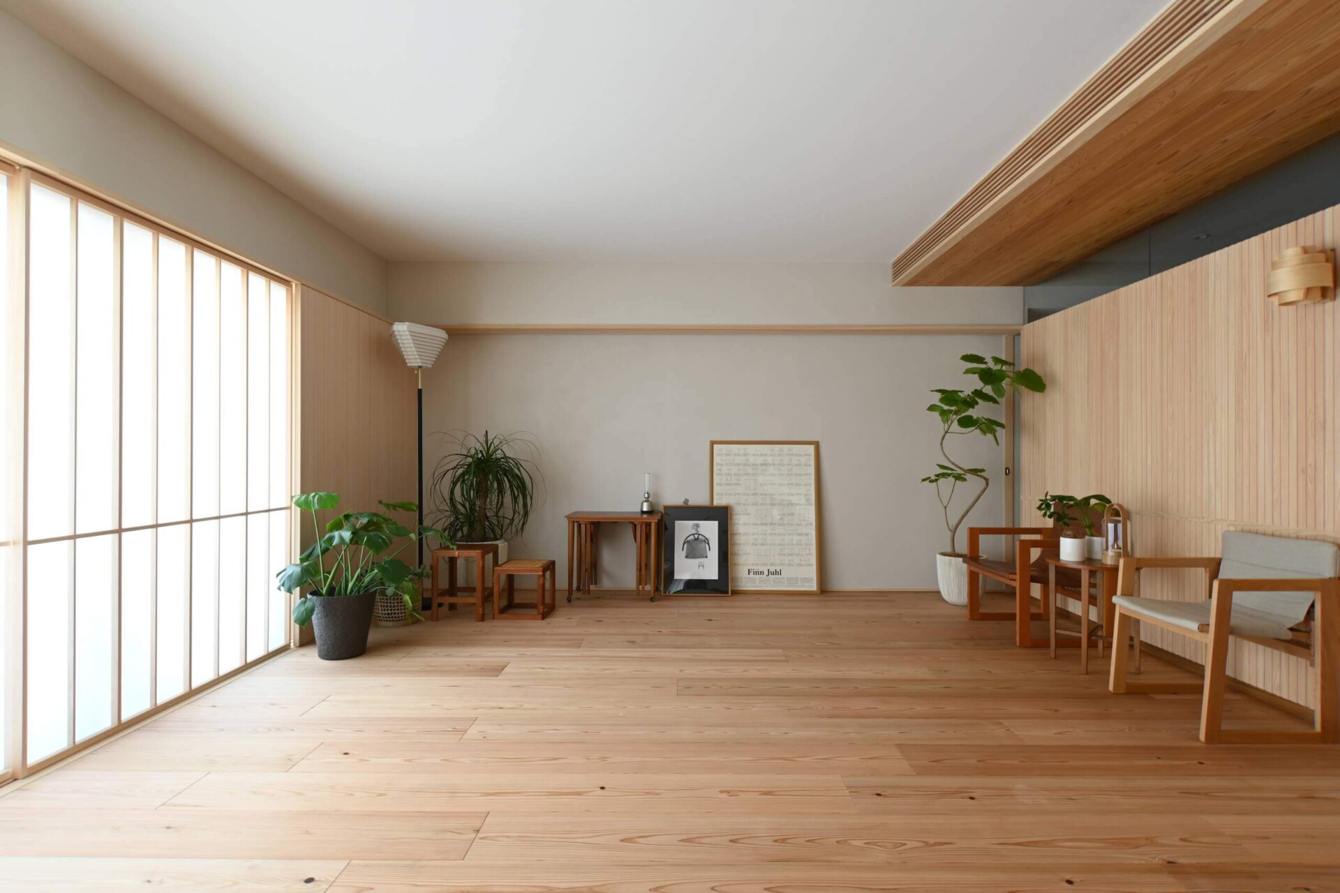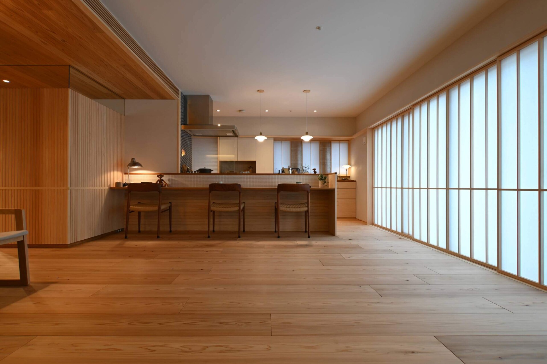 格子風にデザインされた羽目板ですが、実際に施工してみると和風よりになりすぎず、リズミカルで軽やかな印象。桧の優しい色合いや香りを感じる、温かみある空間を演出しています。