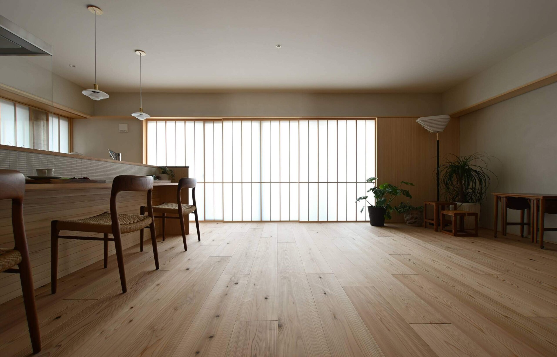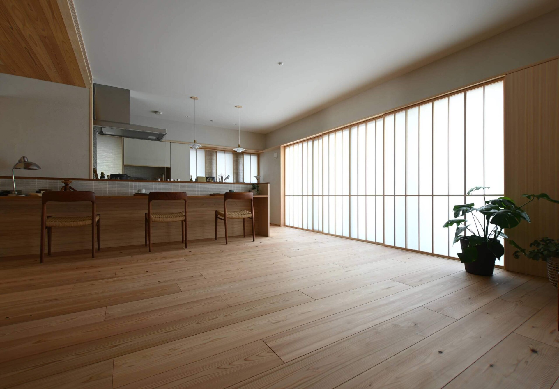 近鉄奈良駅に繋がる商店街の一角にあるマンション角住戸の全面リノベーション。90平米の空間をシングルライフを豊かに送ることのできる空間になるよう計画した。スケルトン解体ののちに外壁部にはウッドファイバーを使った吹き込み断熱を施し、開口部には全て内窓を設け、エアコン一台での全室空調システムも設置して温熱環境の改善を行った。メインの廊下のほか、玄関横のシューズクロークから書籍を納める書庫を抜けウォークインクローゼットまで、また寝室から書斎を経てキッチンまでプラン全体に川の字で動線を3本作り、壁の一部を開閉することで風の流れをリビングまで届けられるようにしている。リビングはならまちの格子のある風景をヒノキの羽目板『こなみいた』で表現、ガラスとミラーを組み合わせることで入れ子状の広がりのある空間としている。