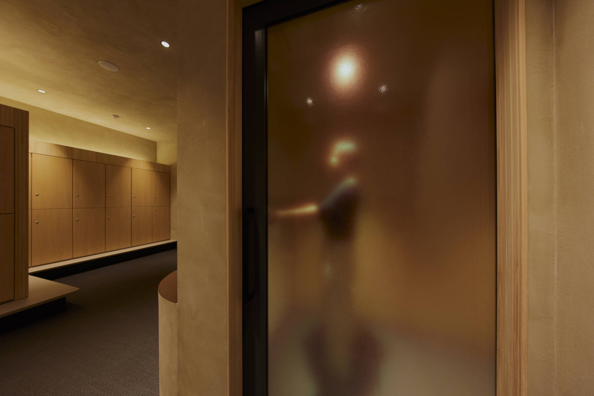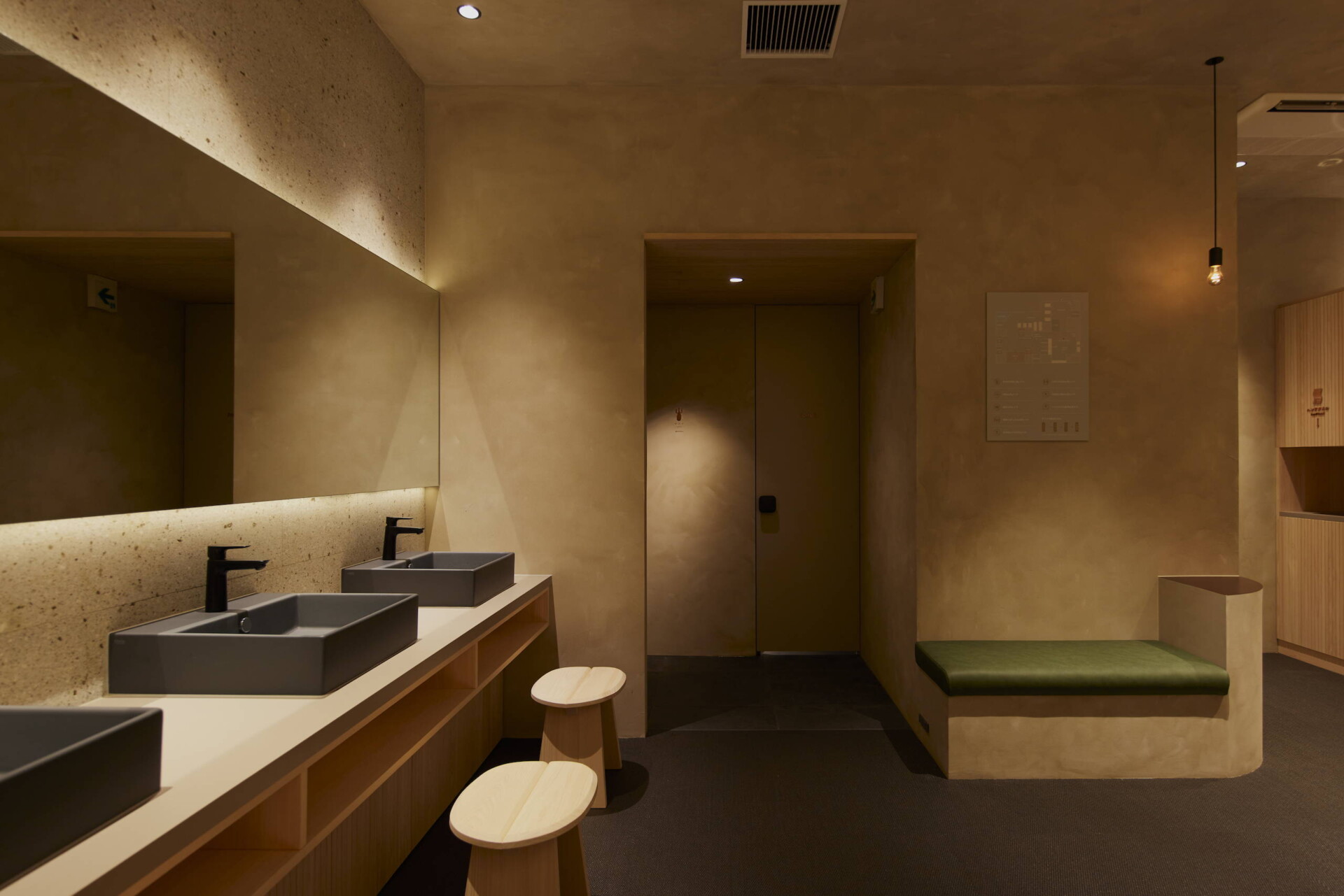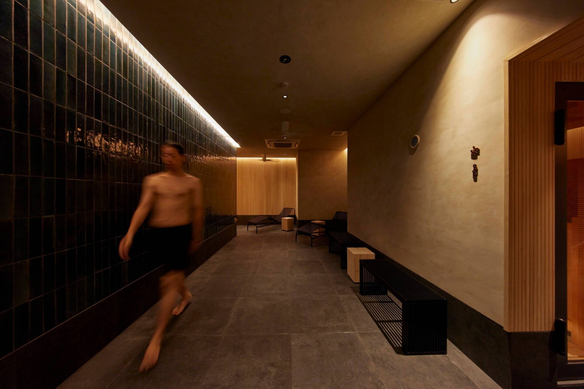 森の芳香を放つ桧の小幅板風羽目板、吸放質効果の高い栃木産大谷石、美しい深緑色の御影石、陰影深い土壁調左官材など、身体に馴染む自然素材をふんだんに用い、明暗に配慮した照明計画、吐水する水音と天井に映る水影、ファンからの緩やかな空気の流速などで“自然の揺らぎ”を表現し、サウナにおける瞑想状態と寄り添うような空間を目指しました。(スウィング/ 金山大 熊澤花絵)
