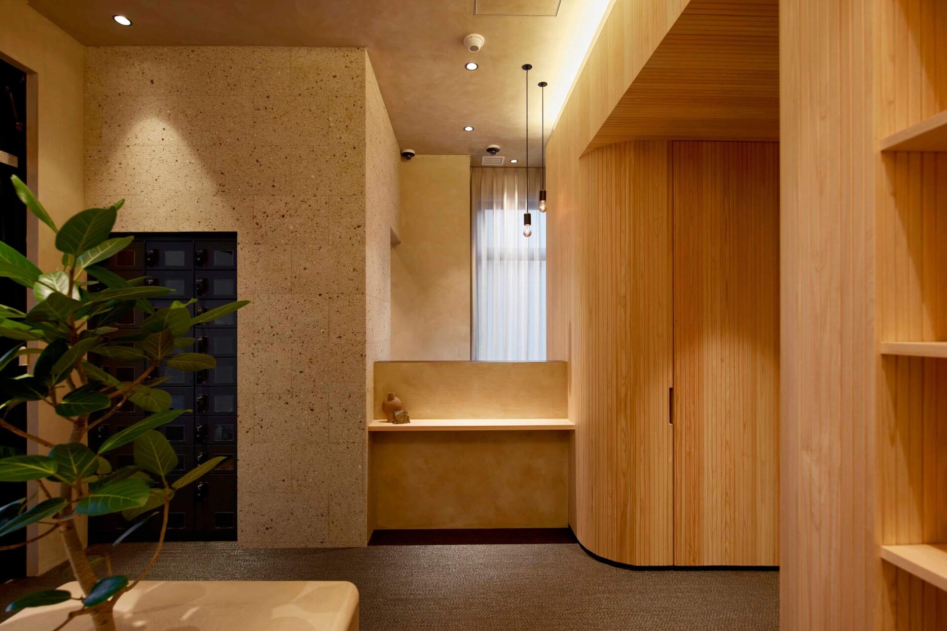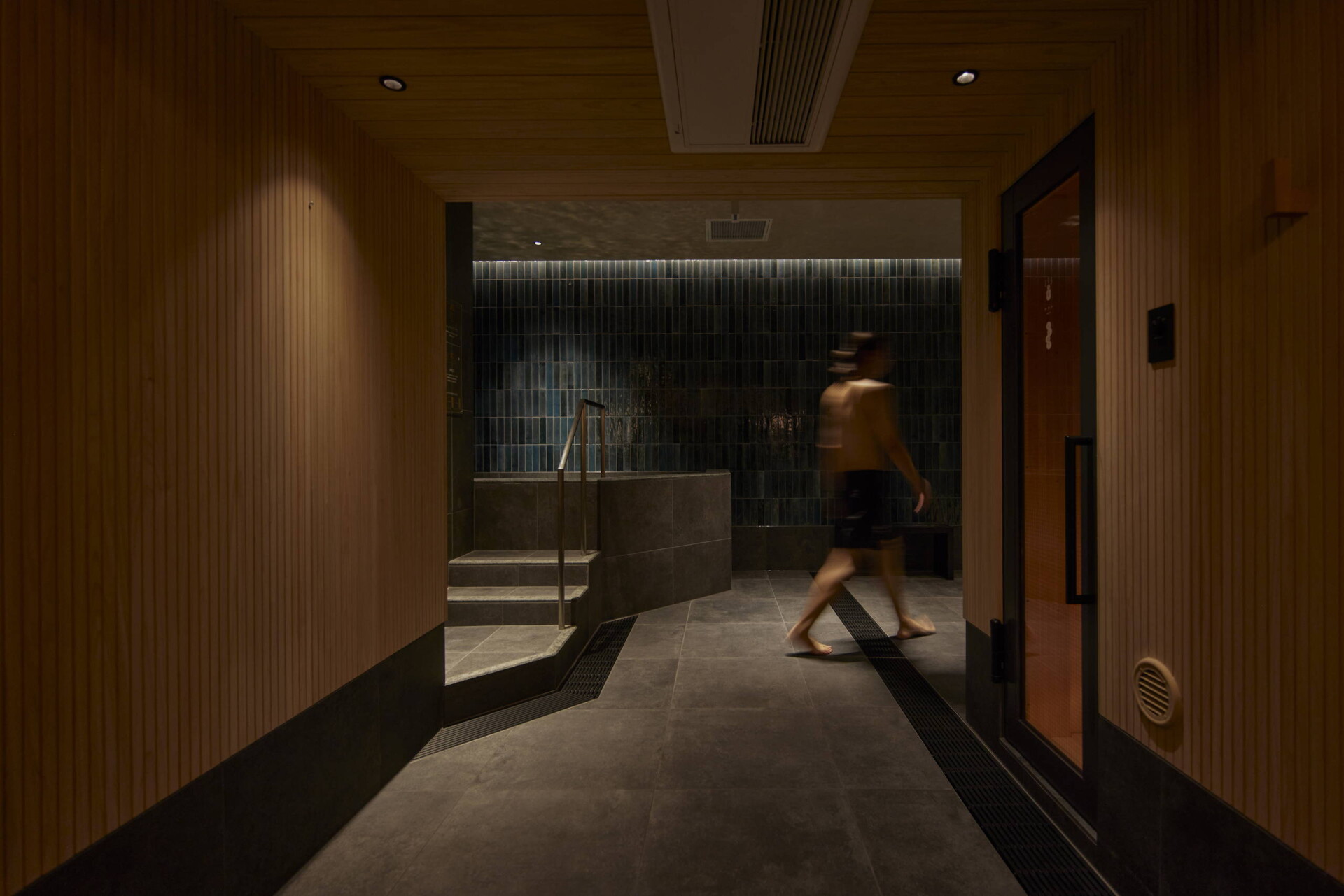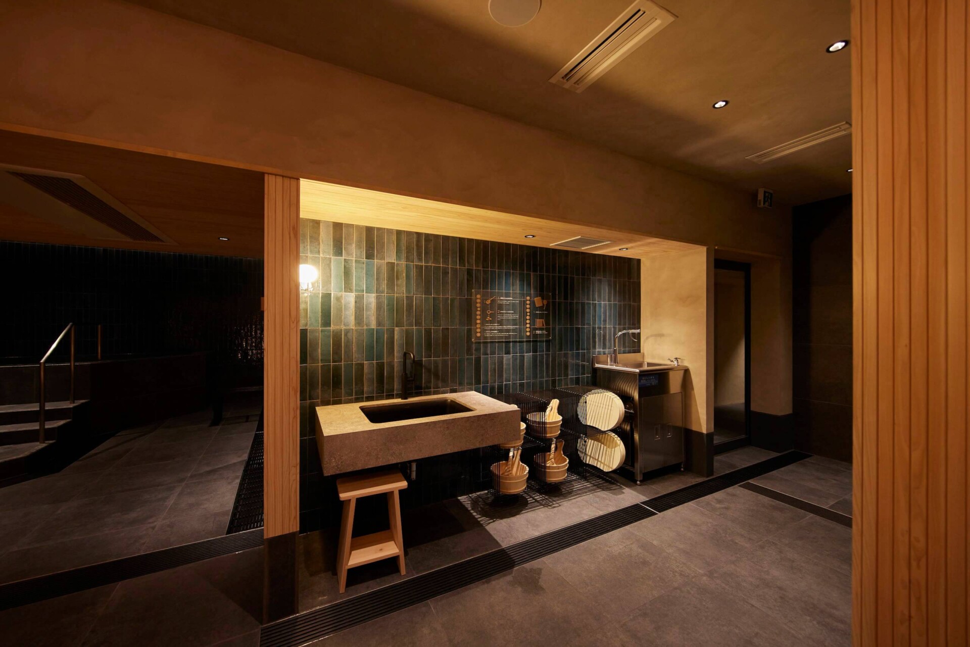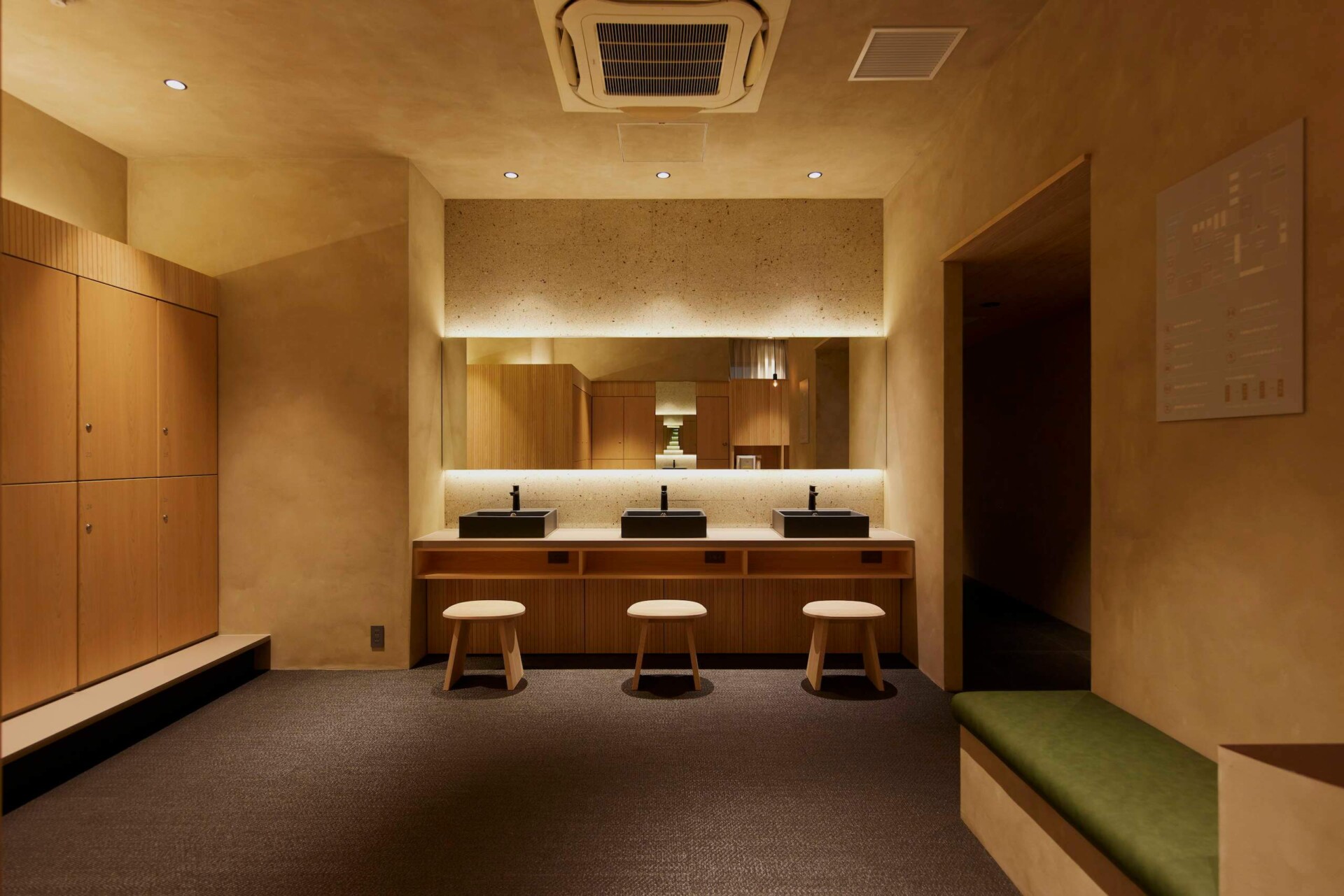 森の芳香を放つ桧の小幅板風羽目板、吸放質効果の高い栃木産大谷石、美しい深緑色の御影石、陰影深い土壁調左官材など、身体に馴染む自然素材をふんだんに用い、明暗に配慮した照明計画、吐水する水音と天井に映る水影、ファンからの緩やかな空気の流速などで“自然の揺らぎ”を表現し、サウナにおける瞑想状態と寄り添うような空間を目指しました。(スウィング/ 金山大 熊澤花絵)