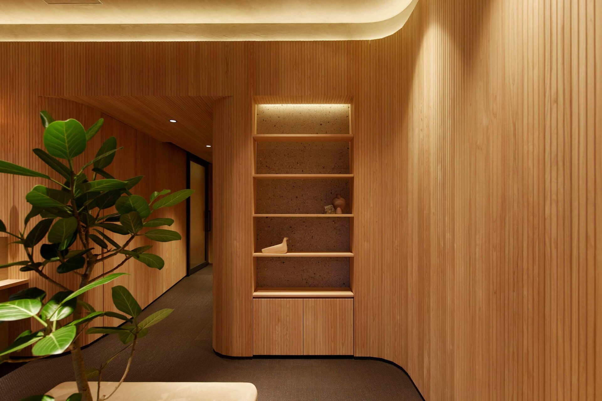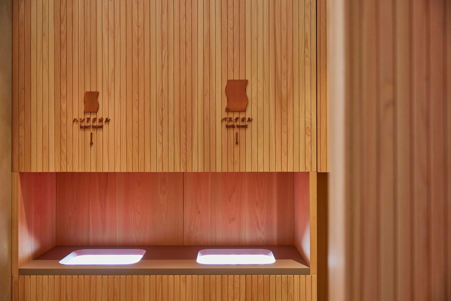 お店に入った瞬間から、森林浴をしているように広がる桧の香りと空気感。素材の統一により“ととのう空間”にふさわしい上質さと落ち着きが感じられます。 また、表面にスリットが入った小幅板風羽目板は吸湿性にも優れているので、全体的に清潔感が漂います。