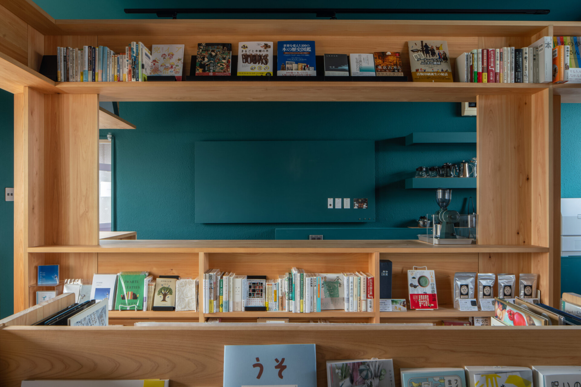 材料はnojimokuで作られる上質なヒノキ幅接ぎ材で、以前より蔵書を増やした本棚としての役割も果たす。素材の既成寸法幅、使い勝手、構造としての成り立ちを総合的に考慮して柱、梁、棚、机が一体となるように設計した。新たな動線やコミュニケーションをうながし、「家具」以上「建築」未満として店に寄り添う柔らかい装置となった。無垢材はどこまで削っても嘘偽りない物質性を担保している素材で頻繁に採用している。