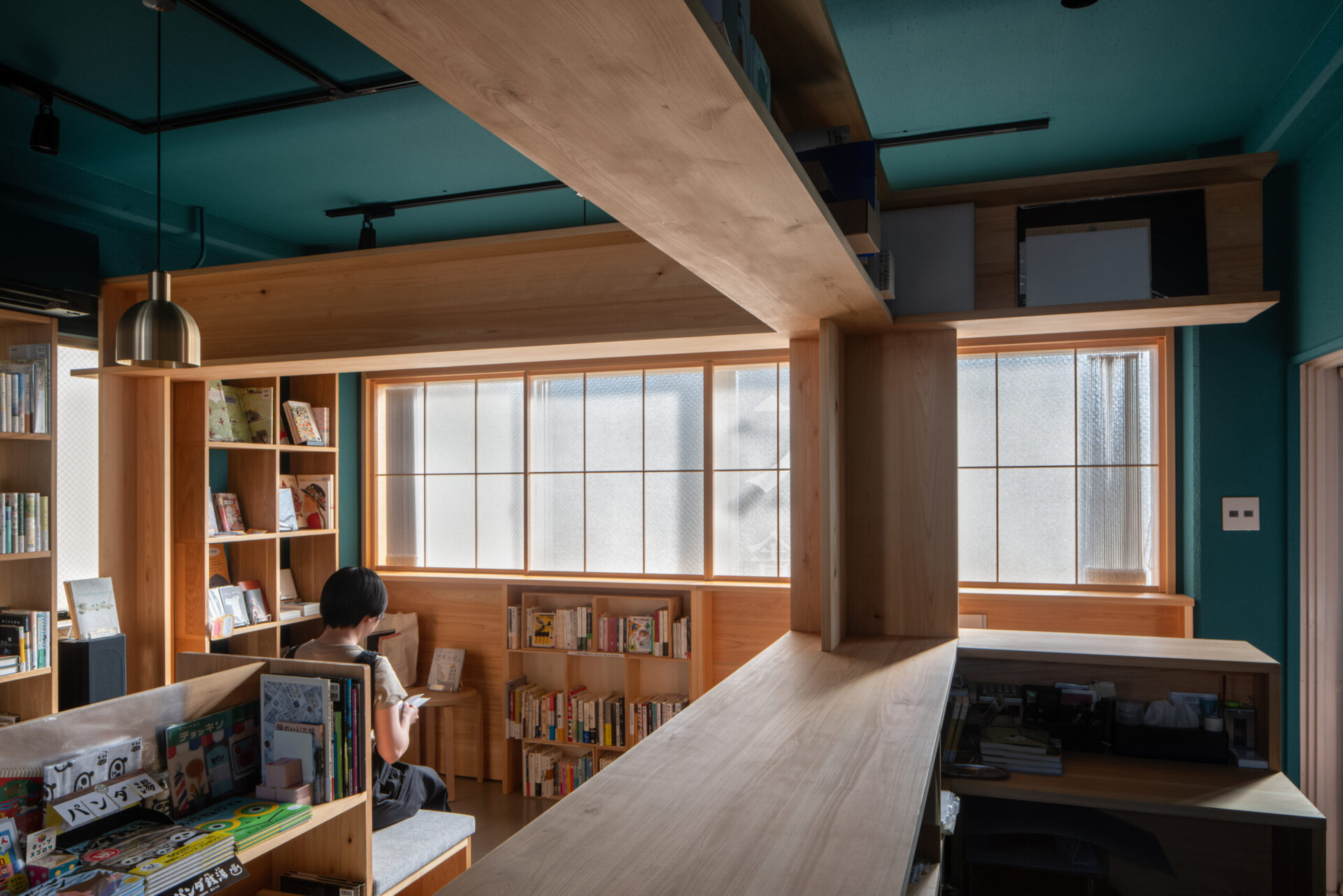 既存の本棚を残しつつコンパクトな矩形平面の店内を緩やかに分ける装置を挿入。