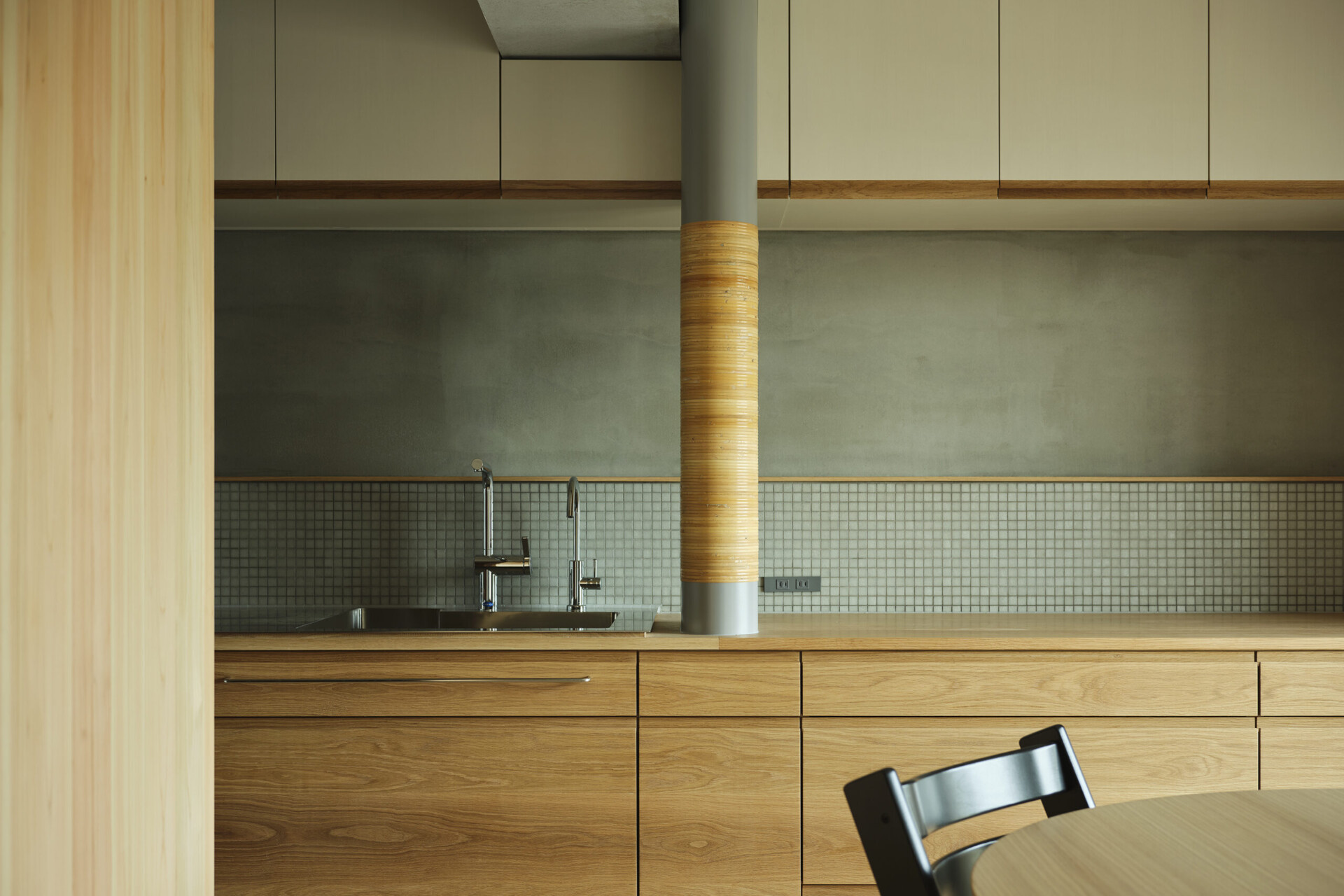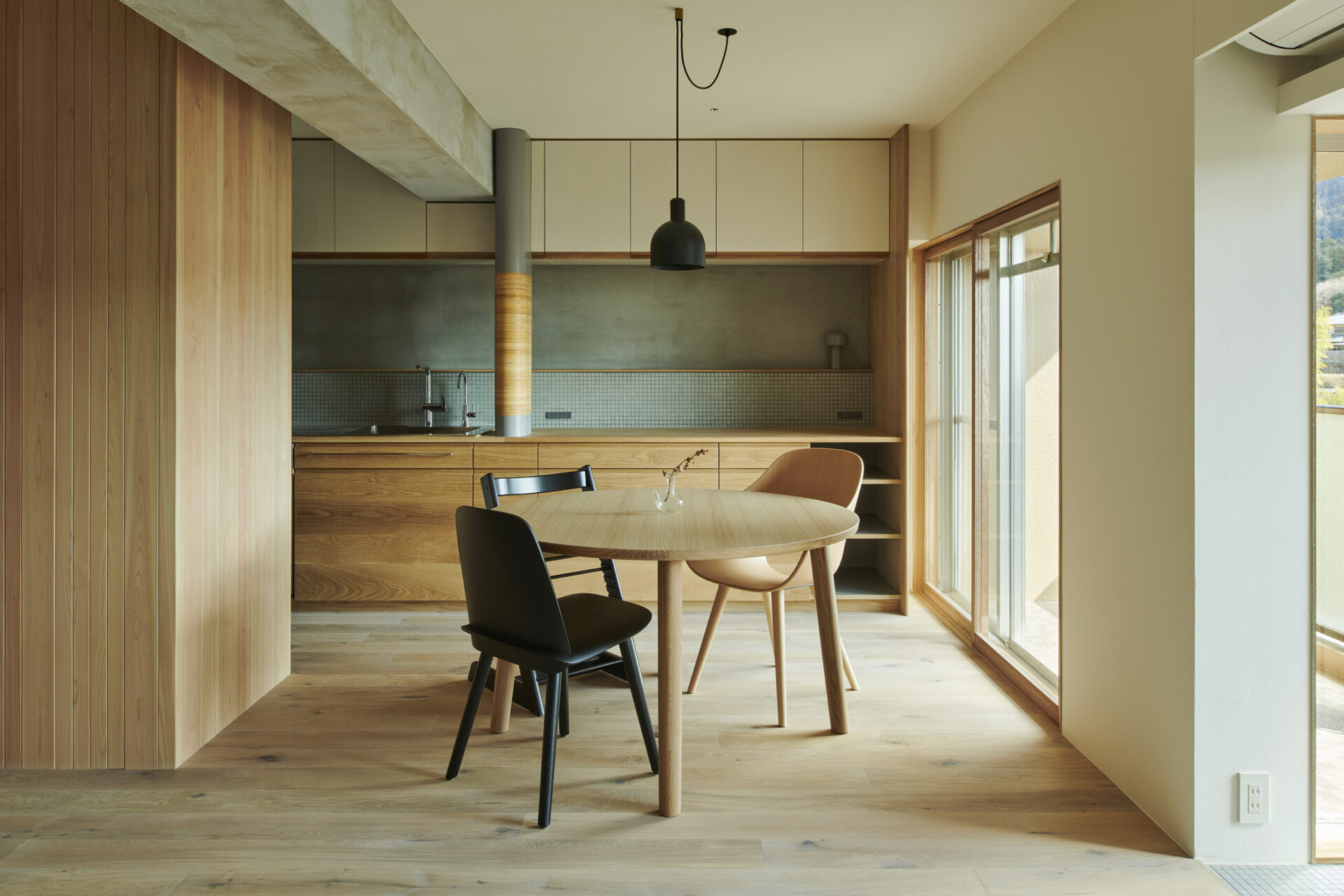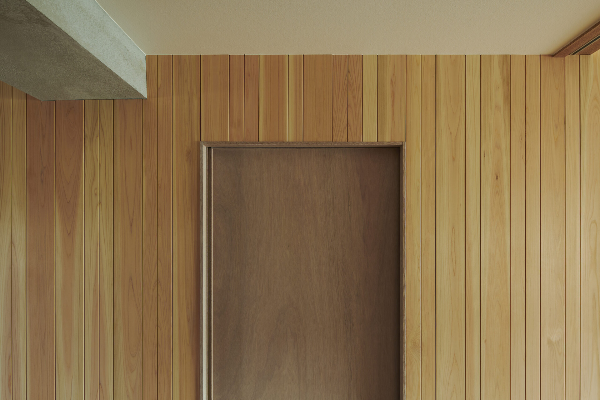 桧と、オークの床板との組み合わせが新鮮。経年変化によりあめ色になっていく桧。