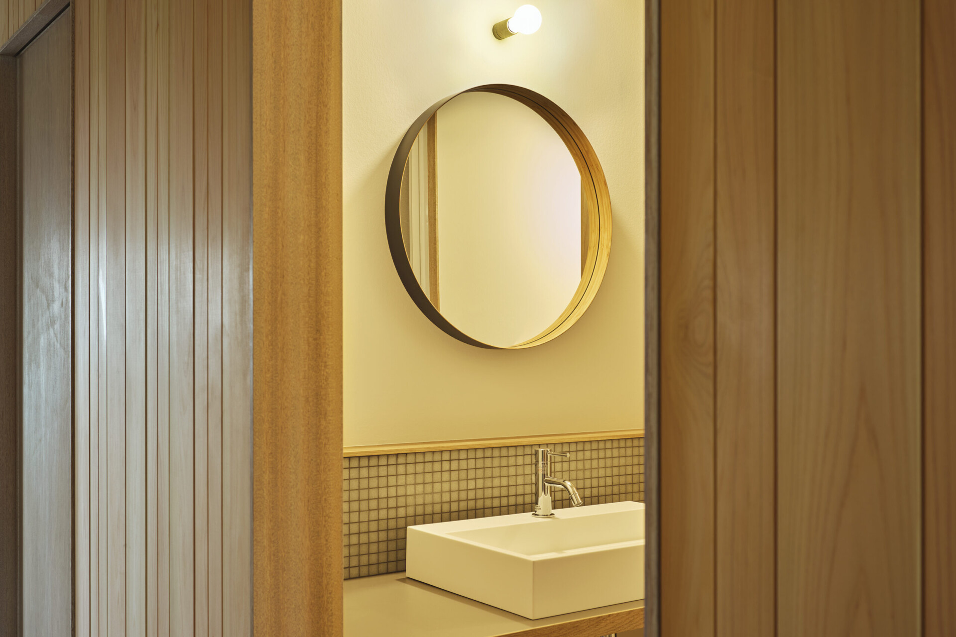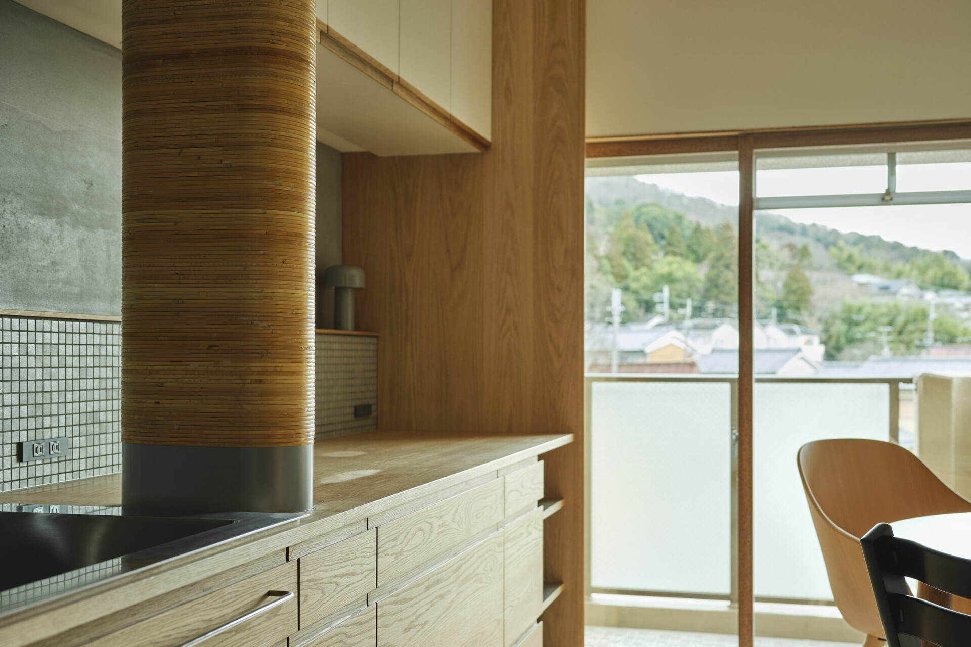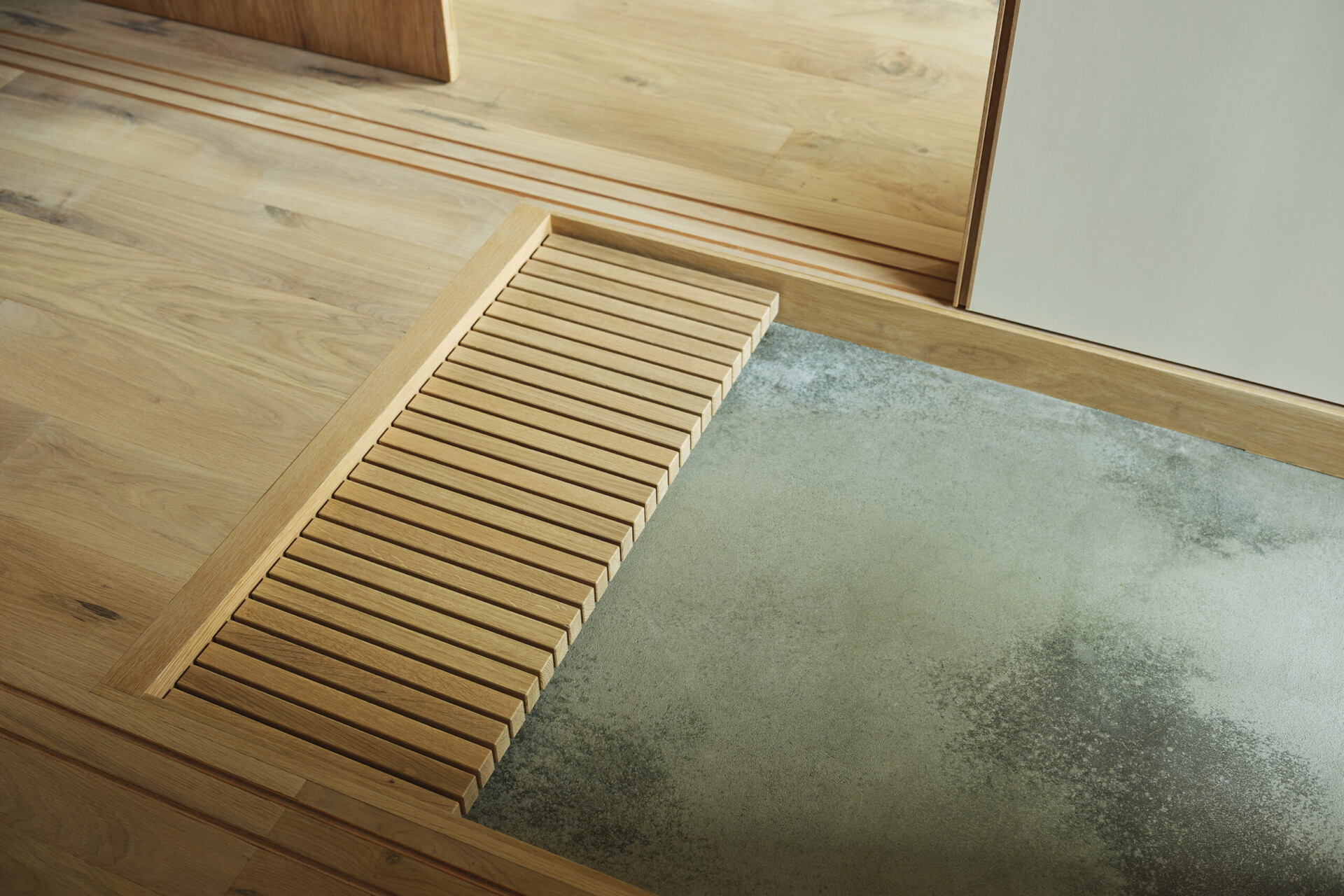 桧と、オークの床板との組み合わせが新鮮。経年変化によりあめ色になっていく桧。