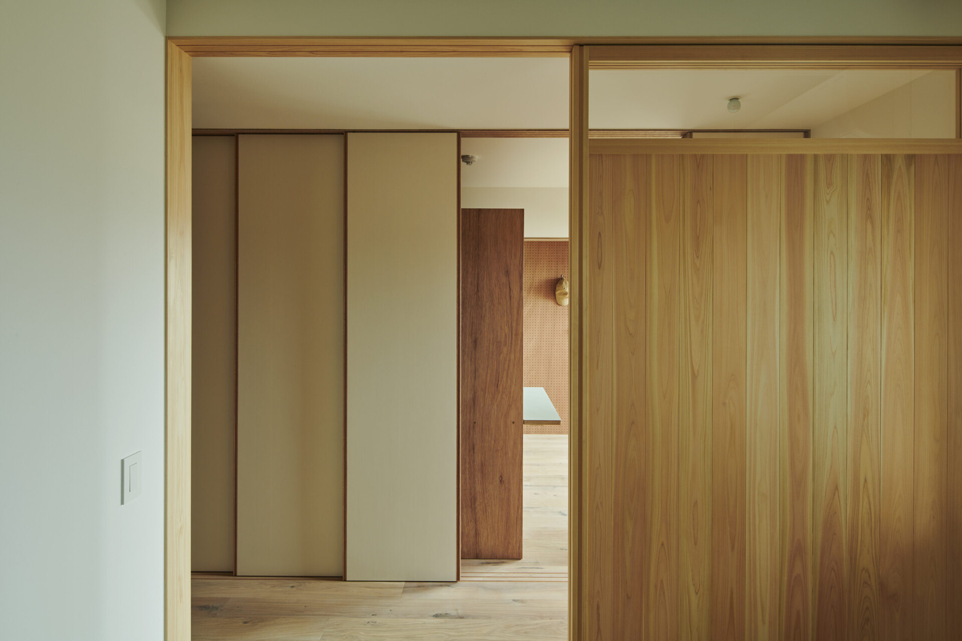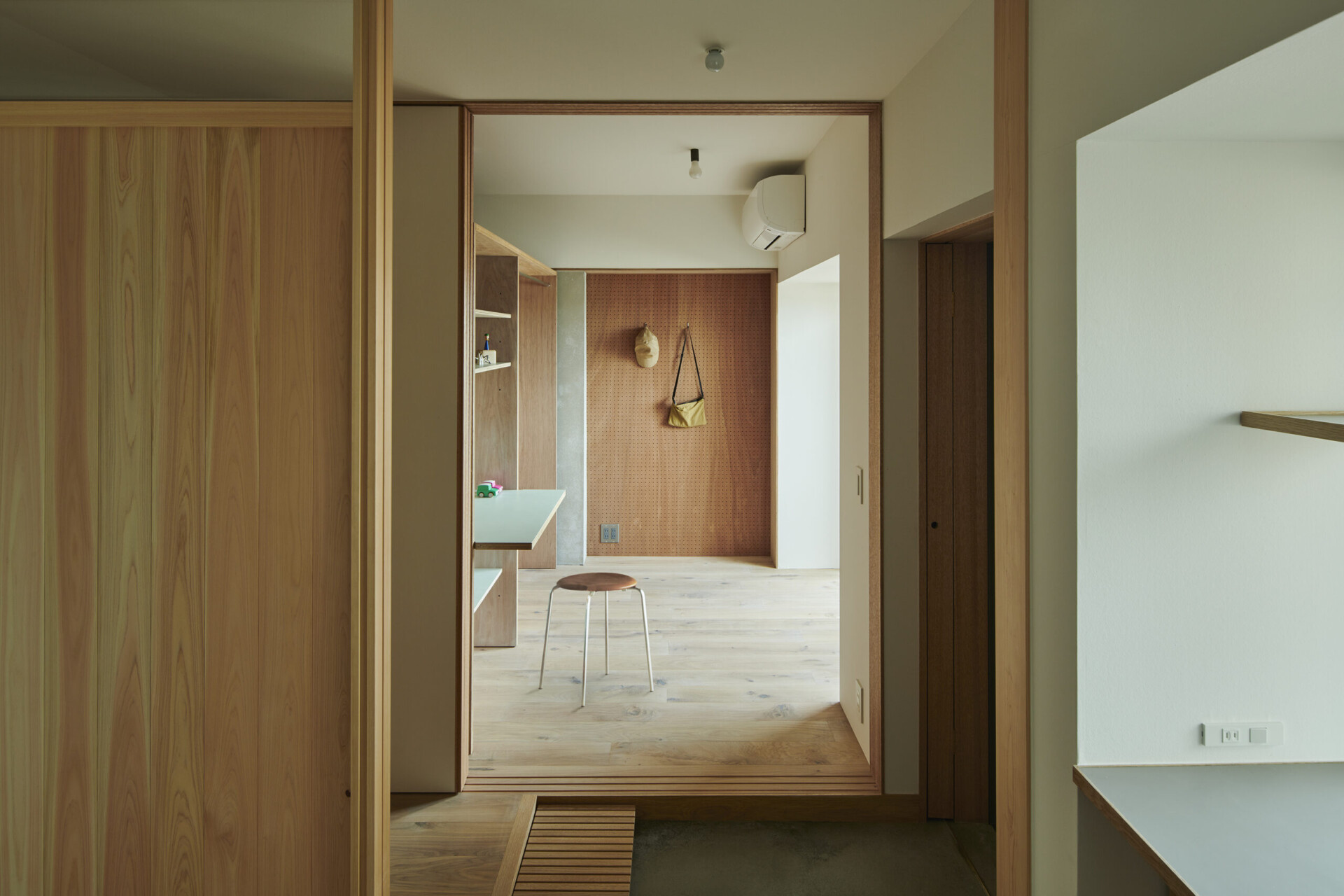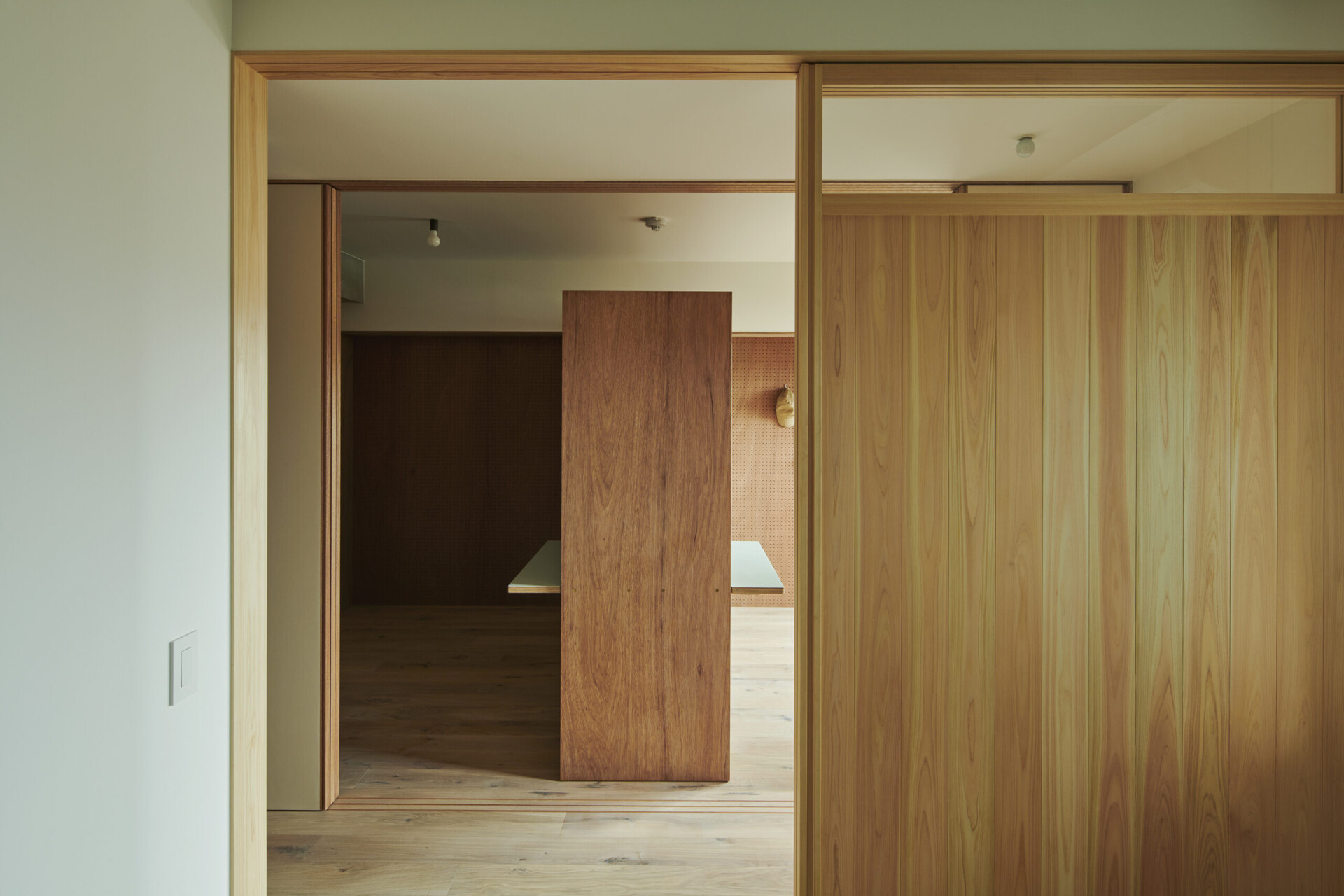 4人家族が約70㎡のフレームの中に、2人の子どもの成長に合わせて柔軟に変化可能な空間を目指し、廊下を挟んで北側にまとめた主寝室と子ども部屋のプライバシーを、8枚の引戸の開き方によってチューニング可能とした。さらに子ども部屋は、可動式の家具の重心によって2つのパーソナルスペースが伸び縮みする。