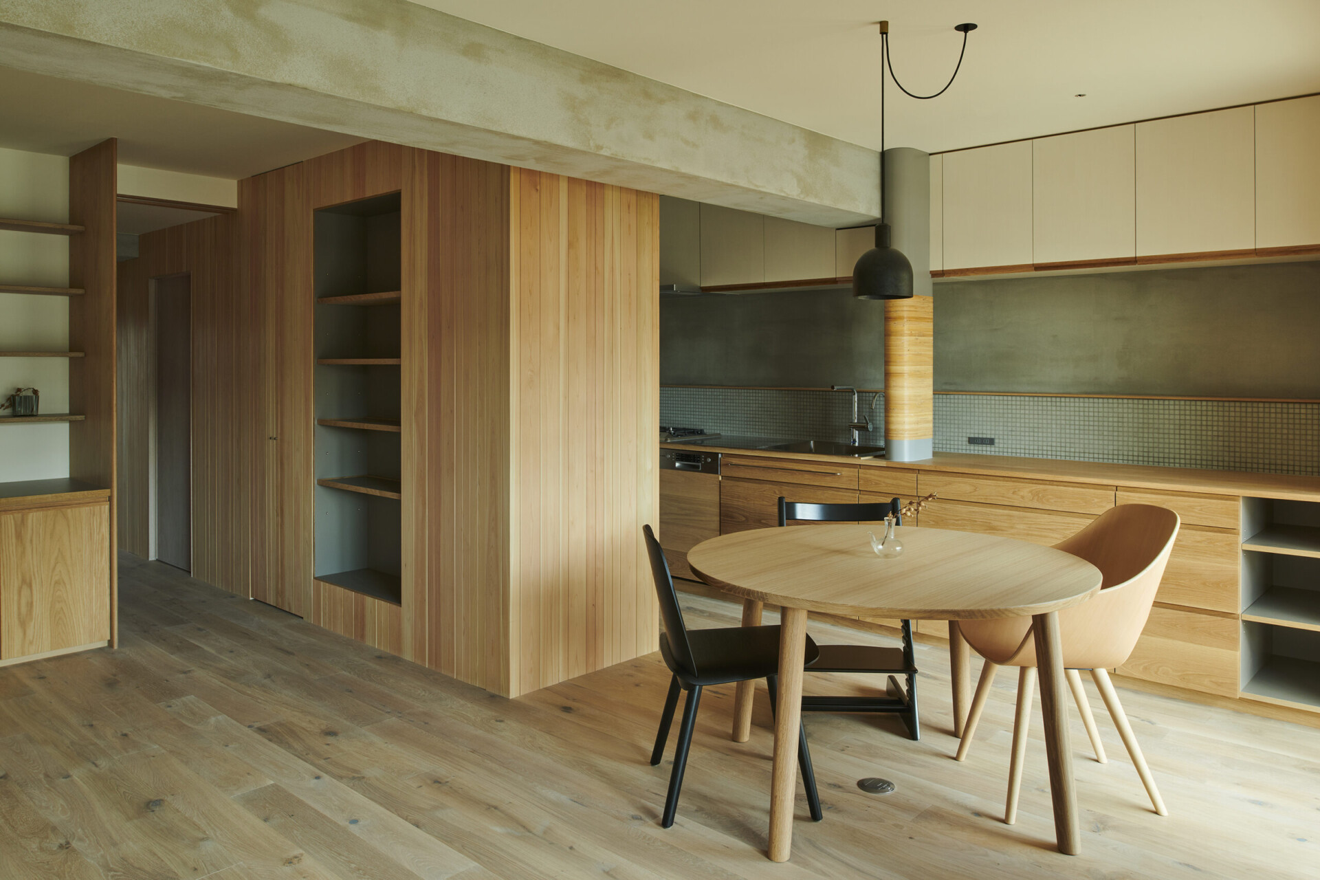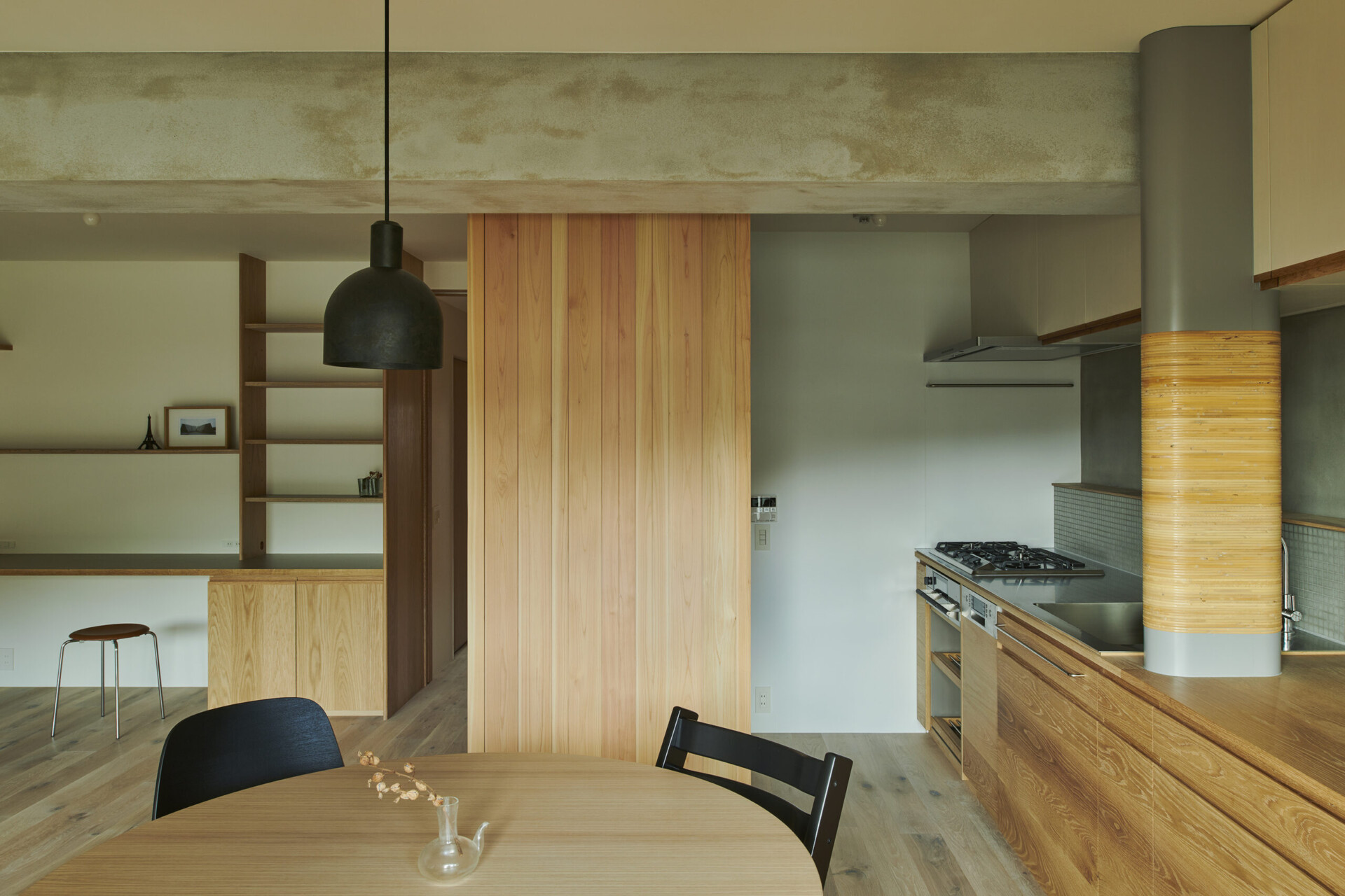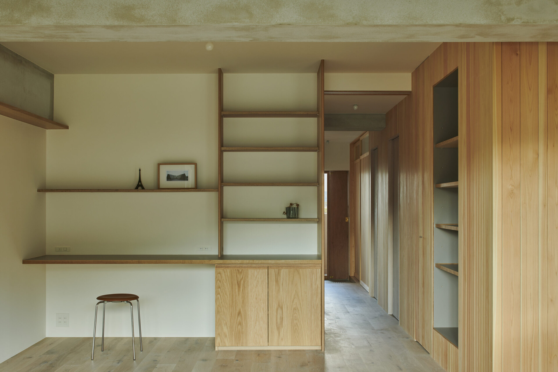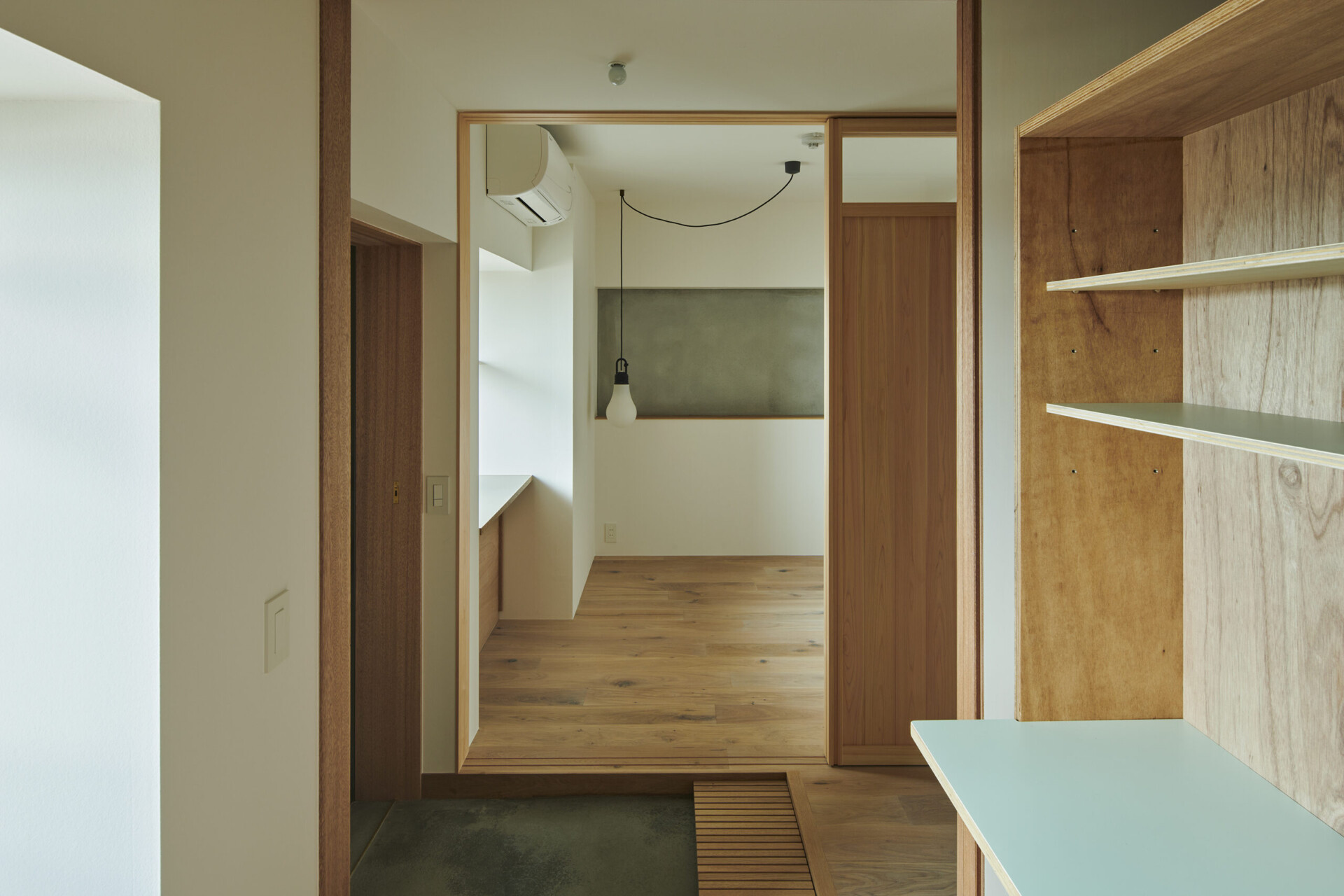 4人家族が約70㎡のフレームの中に、2人の子どもの成長に合わせて柔軟に変化可能な空間を目指し、廊下を挟んで北側にまとめた主寝室と子ども部屋のプライバシーを、8枚の引戸の開き方によってチューニング可能とした。さらに子ども部屋は、可動式の家具の重心によって2つのパーソナルスペースが伸び縮みする。